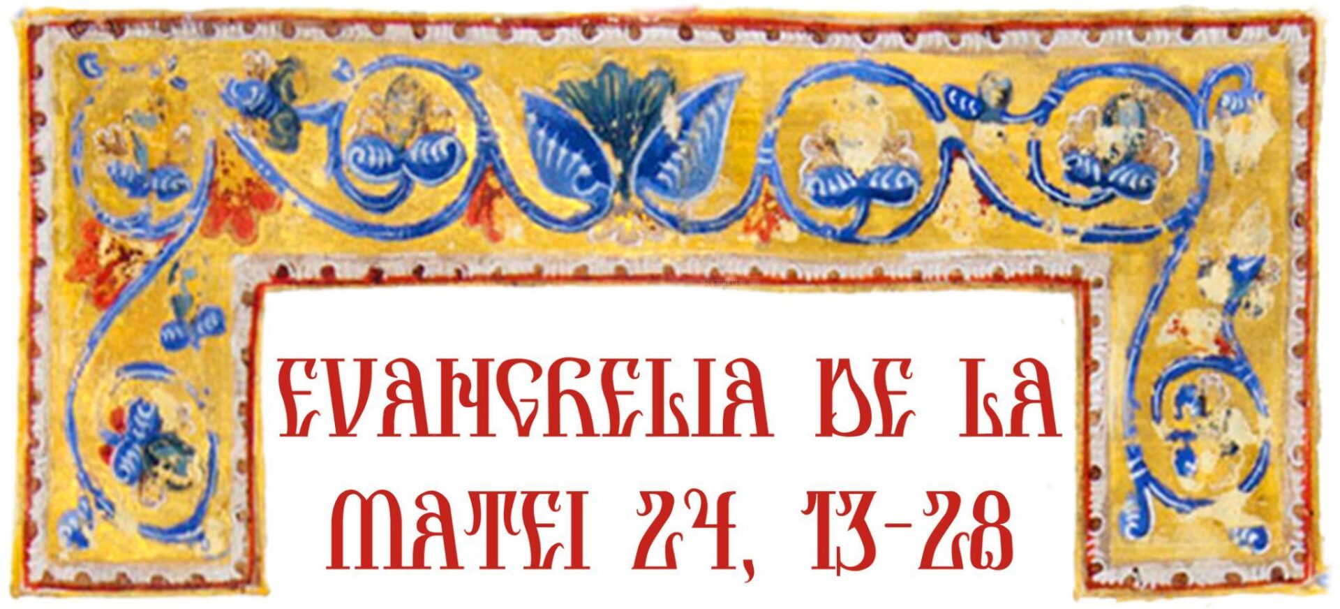 Iisus a spus: „Dar cel ce va răbda până la sfârșit, acela se va mântui. Și se va propovădui această Evanghelie a împărăției în toată lumea spre mărturie la toate neamurile; și atunci va veni sfârșitul. Deci, când veți vedea urâciunea pustiirii ce s-a zis prin Daniel proorocul, stând în locul cel sfânt – cine citește să înțeleagă – atunci cei din Iudeea să fugă în munți. Cel ce va fi pe casă să nu se coboare, ca să-și ia lucrurile din casă. Iar cel ce va fi în țarină să nu se întoarcă înapoi, ca să-și ia haina. Vai de cele însărcinate și de cele ce vor alăpta în zilele acelea! Rugați-vă ca să nu fie fuga voastră iarna, nici sâmbăta. Căci va fi atunci strâmtorare mare, cum n-a fost de la începutul lumii până acum și nici nu va mai fi. Și de nu s-ar fi scurtat acele zile, n-ar mai scăpa nici un trup, dar pentru cei aleși se vor scurta acele zile. Atunci, de vă va zice cineva: Iată, Mesia este aici sau dincolo, să nu-l credeți. Căci se vor ridica hristoși mincinoși și prooroci mincinoși și vor da semne mari și chiar minuni, ca să amăgească, de va fi cu putință, și pe cei aleși. Iată, v-am spus de mai înainte. Deci, de vă vor zice vouă: Iată este în pustie, să nu ieșiți; iată este în cămări, să nu credeți. Căci precum fulgerul iese de la Răsărit și se arată până la Apus, așa va fi și venirea Fiului Omului. Căci unde va fi stârvul, acolo se vor aduna vulturii.”