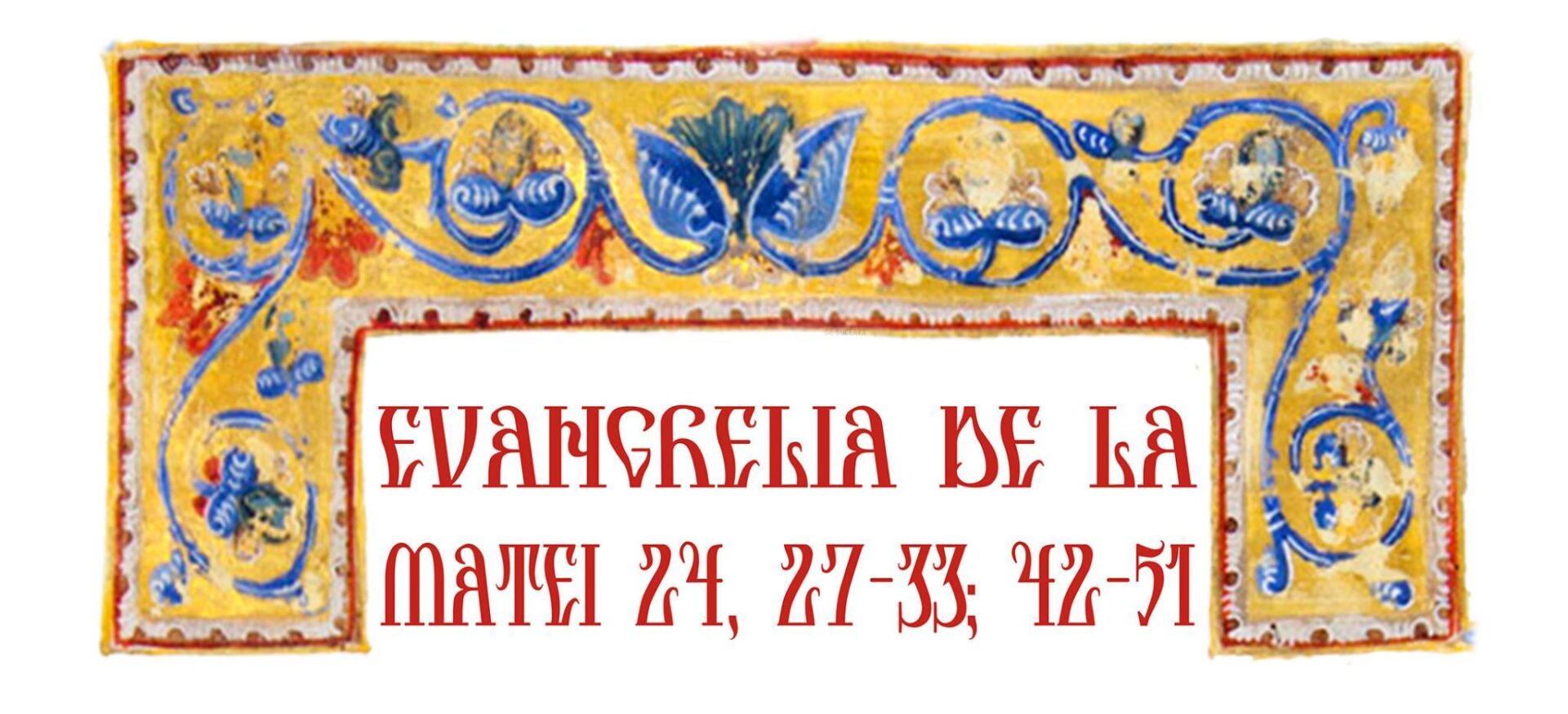 Pasajul evanghelic de astăzi ne aduce mărturie despre cuvintele Domnul nostru Iisus Hristos în legătură cu sfârșitul acestei lumi. Fiecare dintre noi suntem asaltați cu știri care mai de care mai fanteziste despre ce este sau cum va fi sfârșitul lumii. Așa cum ne mărturisește Sfânta Scriptură, sfârșitul va fi un timp de judecată a faptelor fiecăruia dintre noi. Să fim cu luare aminte la cuvintele Domnului Hristos: „Privegheați, că nu știți în care zi vine Domnul vostru”. Tocmai pentru că nu știm care și când va fi acea zi trebuie să ne ducem viața ca și cum sfârșitul ei ar fi în clipa de față. In conformitate cu spusele Mântuitorului ar fi bine să reținem și faptul că nimeni nu știe ziua acestui sfârșit. Dacă ne va găsi înglodați în păcate putem intui care ne va fi răsplata veșnică. Dacă ne va găsi pe calea spre desăvârșire, sufletul fiecăruia dintre noi va sălășlui în veșnicia lui Dumnezeu.