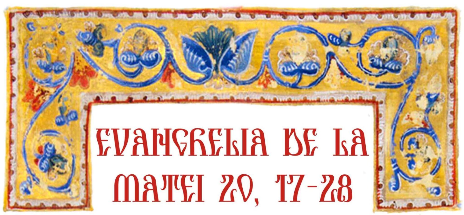 „Suindu-Se la Ierusalim, Iisus a luat de o parte pe cei doisprezece ucenici și le-a spus lor, pe cale: Iată ne suim la Ierusalim și Fiul Omului va fi dat pe mâna arhiereilor și a cărturarilor, și-L vor osândi la moarte; Îl vor da pe mâna păgânilor, ca să-L batjocorească și să-L răstignească; dar a treia zi va învia. Atunci a venit la El mama fiilor lui Zevedeu, împreună cu fiii ei, închinându-se și cerând ceva de la El. Iar El a zis ei: Ce voiești? Ea a zis Lui: Zi ca să șadă acești doi fii ai mei, unul de-a dreapta și altul de-a stânga Ta, întru împărăția Ta. Dar Iisus, răspunzând, a zis: Nu știți ce cereți. Puteți, oare, să beți paharul pe care-l voi bea Eu și cu botezul cu care Eu Mă botez să vă botezați? Ei I-au zis: Putem. Și El a zis lor: Paharul Meu veți bea și cu botezul cu care Eu Mă botez vă veți boteza, dar a ședea de-a dreapta și de-a stânga Mea nu este al Meu a da, ci se va da celor pentru care s-a pregătit de către Tatăl Meu. Și auzind cei zece s-au mâniat pe cei doi frați. Dar Iisus, chemându-i la Sine, a zis: Știți că ocârmuitorii neamurilor domnesc peste ele și cei mari le stăpânesc. Nu tot așa va fi între voi, ci care între voi va vrea să fie mare să fie slujitorul vostru. Și care între voi va vrea să fie întâiul să vă fie vouă slugă. După cum și Fiul Omului n-a venit să I se slujească, ci ca să slujească El și să-Și dea sufletul răscumpărare pentru mulți.”
