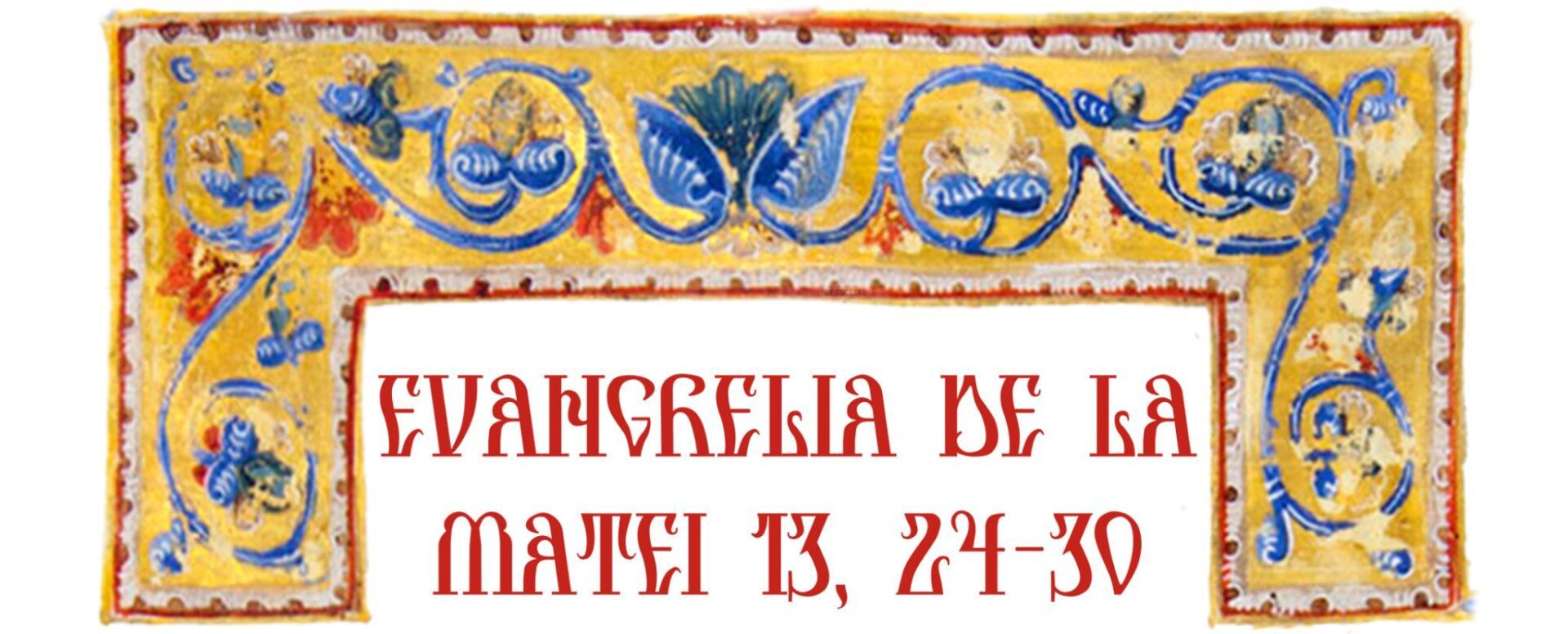 „Iisus le-a pus lor altă pildă, zicând: «Asemenea este împărăția cerurilor omului care a semănat sămânță bună în țarina sa. Dar pe când oamenii dormeau, a venit vrăjmașul lui, a semănat neghină printre grâu și s-a dus. Iar dacă a crescut paiul și a făcut rod, atunci s-a arătat și neghina. Venind slugile stăpânului casei, i-au zis: ”Doamne, n-ai semănat tu, oare, sămânță bună în țarina ta? De unde dar are neghină?”. Iar el le-a răspuns: ”Un om vrăjmaș a făcut aceasta”. Slugile i-au zis: ”Voiești deci să ne ducem și s-o plivim”. El însă a zis: ”Nu, ca nu cumva, plivind neghina, să smulgeți odată cu ea și grâul. Lăsați să crească împreună și grâul și neghina, până la seceriș; și la vremea secerișului voi zice secerătorilor: Pliviți întâi neghina și legați-o în snopi ca s-o ardem, iar grâul adunați-l în jitnița mea».”