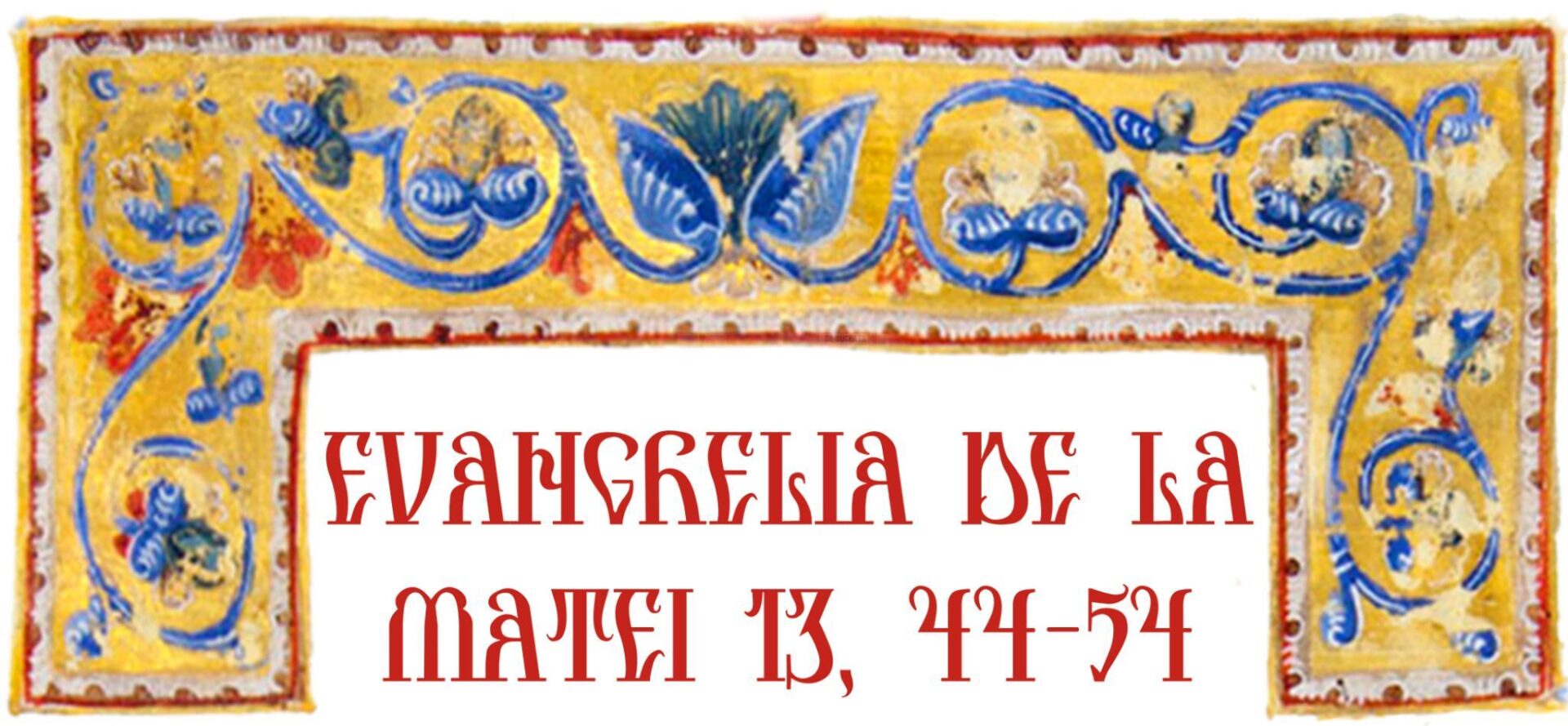 Iisus a spus: „«Asemenea este împărăția cerurilor cu o comoară ascunsă în țarină, pe care, găsind-o un om, a ascuns-o, și de bucuria ei se duce și vinde tot ce are și cumpără țarina aceea. Iarăși asemenea este împărăția cerurilor cu un neguțător care caută mărgăritare bune. Și aflând un mărgăritar de mult preț, s-a dus, a vândut toate câte avea și l-a cumpărat. Asemenea este iarăși împărăția cerurilor cu un năvod aruncat în mare și care adună tot felul de pești. Iar când s-a umplut, l-au tras pescarii la mal și, șezând, au ales în vase pe cei buni, iar pe cei răi i-au aruncat afară. Așa va fi la sfârșitul veacului: vor ieși îngerii și vor despărți pe cei răi din mijlocul celor drepți. Și îi vor arunca în cuptorul cel de foc; acolo va fi plângerea și scrâșnirea dinților. Înțeles-ați toate acestea?». Zis-au Lui: «Da, Doamne». Iar El le-a zis: «De aceea, orice cărturar cu învățătură despre împărăția cerurilor este asemenea unui om gospodar, care scoate din vistieria sa noi și vechi». Iar după ce Iisus a sfârșit aceste pilde, a trecut de acolo. Și venind în patria Sa, îi învăța pe ei în sinagoga lor, încât ei erau uimiți și ziceau: «De unde are El înțelepciunea aceasta și puterile?».”