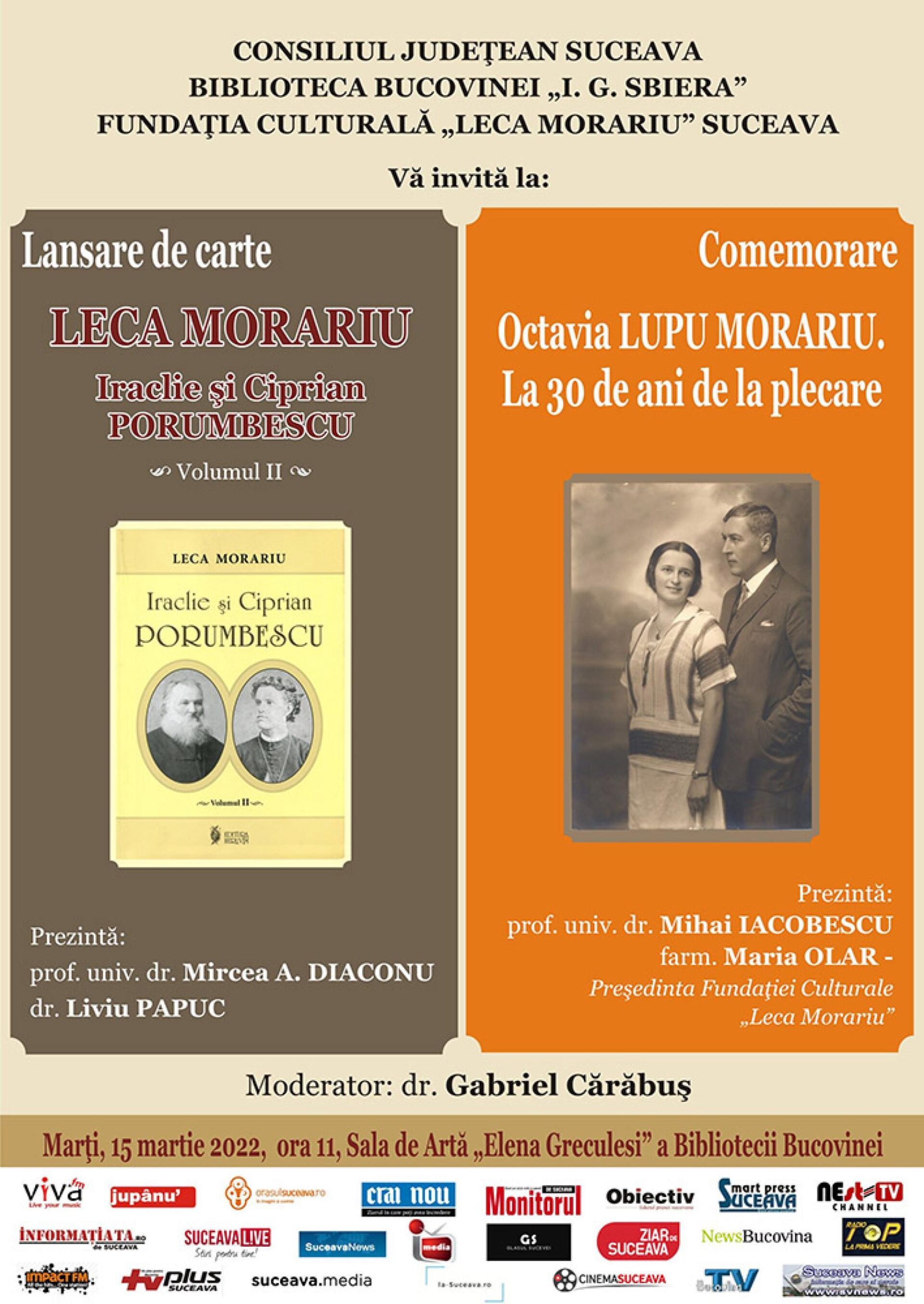 Biblioteca Bucovinei „I. G. Sbiera” Suceava organizează, marți, 15 martie, la ora 11:00, în Sala de Artă „Elena Greculesi”, prima manifestare culturală după încetarea restricțiilor anti-Covid. În cadrul acțiunii culturale va fi lansat volumul al II-lea al lucrării „Iraclie și Ciprian Porumbescu”, de Leca Morariu. Prezintă: prof. univ. dr. Mircea A. Diaconu, dr. Liviu Papuc.