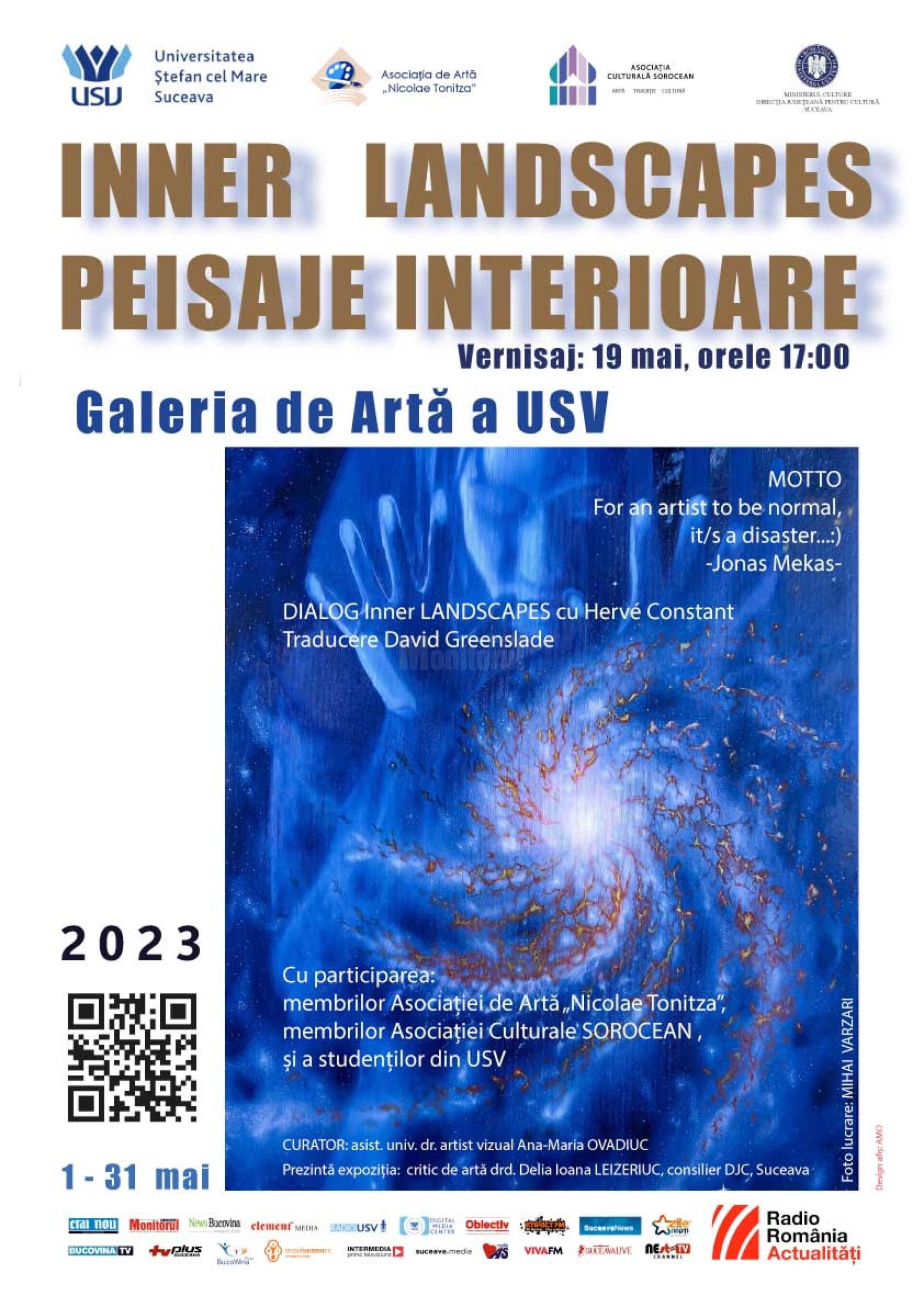 La Galeria de Artă a Universității „Ștefan cel Mare” din Suceava, Corpul A, Etajul I, va avea loc vineri, 19 mai 2023, la ora 17:00, evenimentul cultural „Inner Landscapes/ Peisaje Interioare”. Expun artiștii: Mihai Varzari, Maria Claudia Prelipcean, Leonard Adrian Melisch, Ana-Maria Ovadiuc AMO, Marina Pișta, Cristina Iuliana Iacob, invitat C-tin Ungureanu BOX, Genoveva Bogdan, Sorin Mihai Bărgăoan, Lila Lungulescu, Nicoleta Butnariu, Valeriu Gorgan, Robert Voitchevici și Maria Ionela Pălimaru.Alături de ei vor expune lucrări plastice și studenții: Alexandra Țibu (FMSB, anul III), Ana Gabriela Gorbaciuc (FLSC, MD, anul II), Alexandra Căruceriu (FLSC, MD, anul II) și Alexia Alexinschi (Colegiul de artă „Ciprian Porumbescu” din Suceava).