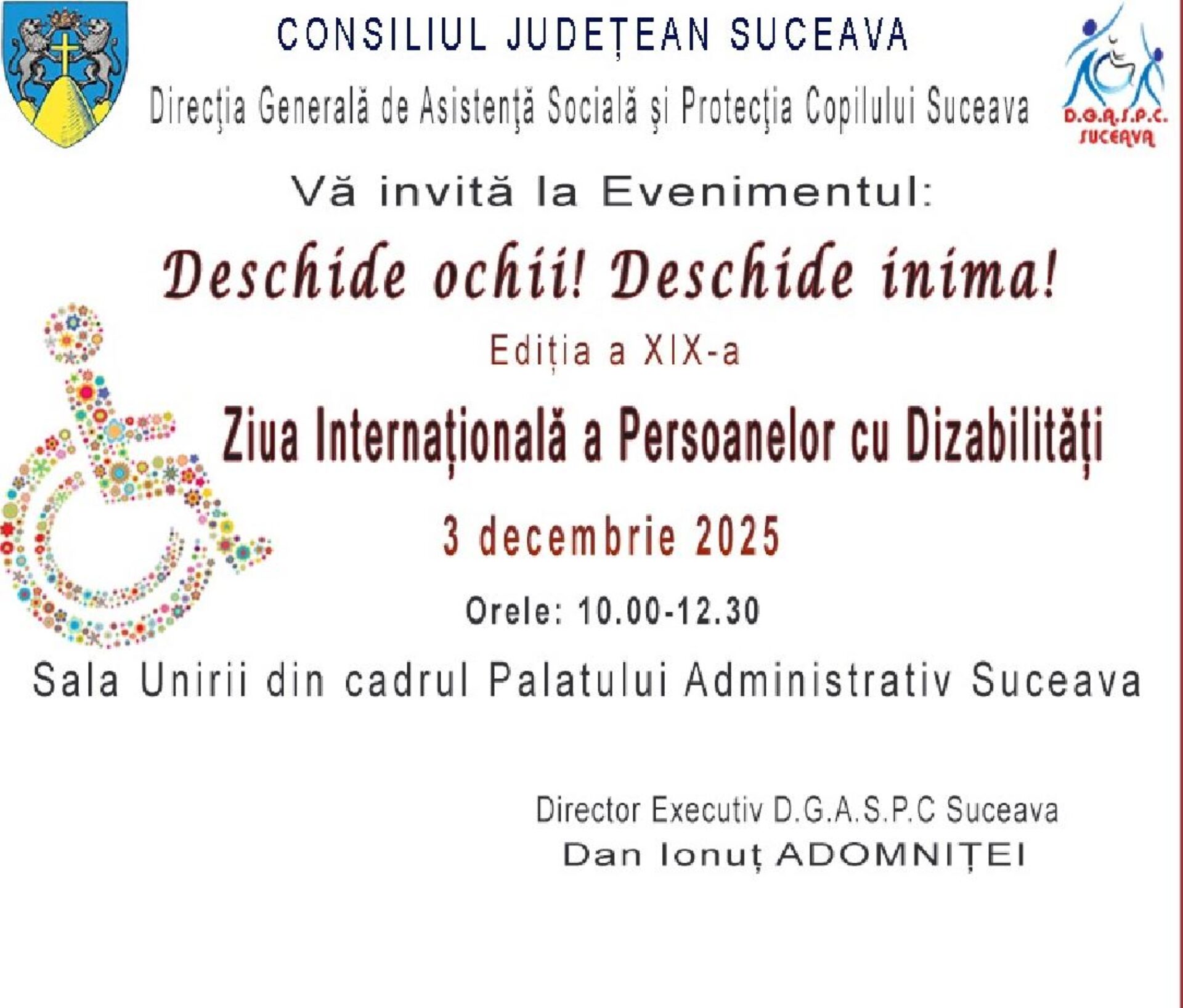 Consiliul Județean Suceava, prin Direcția Generală de Asistență Socială și Protecția Copilului (DGASPC) Suceava, împreună cu parteneri locali, organizează miercuri, 3 decembrie 2025, începând cu ora 10.00, la Sala Unirii – Palatul Administrativ Suceava, evenimentul „Deschide ochii, deschide inima”, ediția a XIX-a. Aproximativ 100 de copii și tineri vor lua parte la un spectacol și vor organiza o expoziție.