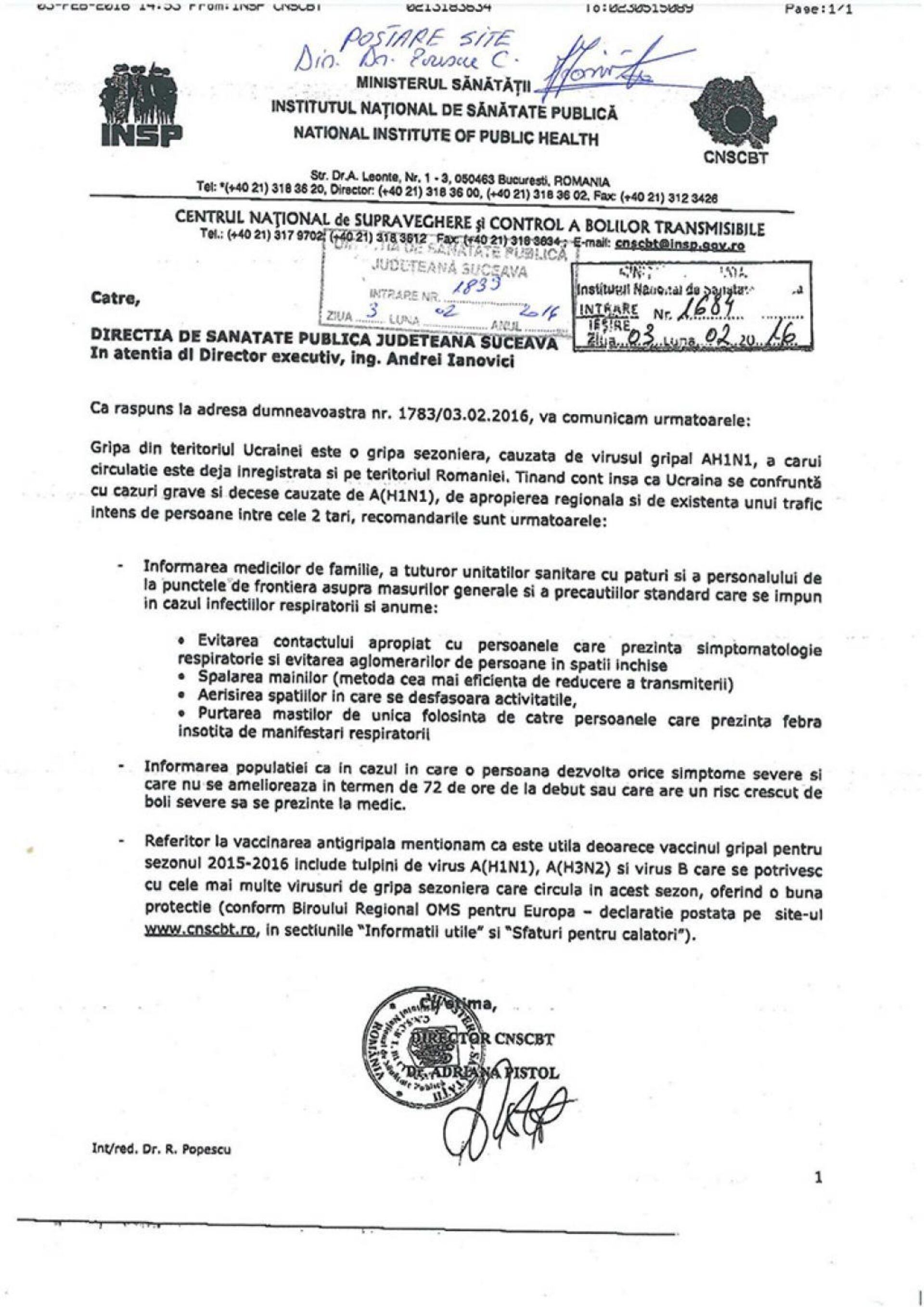 În recomandările trimise oficial de Ministerul Sănătății către autoritățile județului Suceava nu se spune nimic de detașări de ambulanțe, puncte medicale și examinări medicale în frontieră, de solicitări de atestare a vaccinării antigripale a călătorilor și interzicere a accesului în țară a copiilor nevaccinați antigripal, așa cum a decis în exces de zel, sâmbătă, Comitetul Județean pentru Situații de Urgență Suceava, în ședința extraordinară condusă de președintele acestuia, prefectul Constantin Harasim.