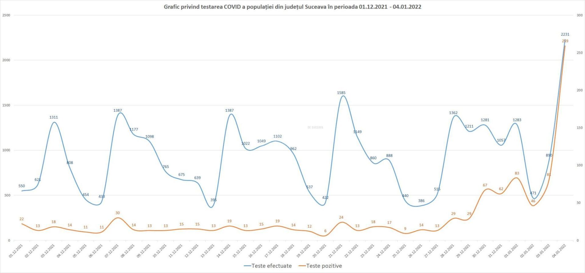 În ultima săptămână, Suceava s-a plasat în prima parte a clasamentului în topul numărului zilnic de noi infectări, iar marți s-a înregistrat o triplare a numărului de cazuri noi: 256 de persoane infectate, din 2.231 de persoane testate, față de 81 de cazuri noi, din ziua precedentă și 92 de cazuri în ziua de 1 ianuarie. În data de 24 decembrie numărul cazurilor de infectare a fost de 17, iar cu două săptămâni mai devreme, în 10 decembrie, au fost 13 cazuri noi de infectare. Peste 200 de cazuri au mai fost în valul patru, 238 de cazuri în 7 octombrie 2021. Marți, doar în București s-au înregistrat mai multe cazuri decât în județul Suceava, 677 de cazuri.