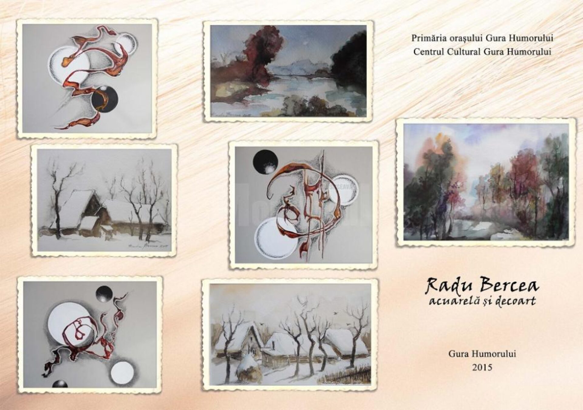 Primăria Orașului Gura Humorului și Centrul Cultural Gura Humorului organizează joi, 12 martie a.c., la ora 16.00, în sala de expoziții a Casei de Cultură din localitate, vernisajul expoziției „Acuarelă și decoart”, realizată de artistul plastic humorean Radu Bercea.