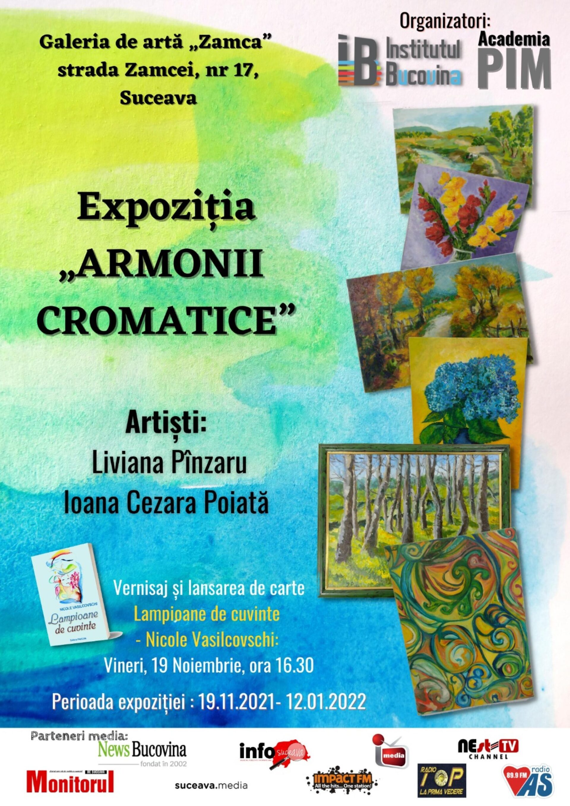 La Galeria de artă „Zamca” va avea loc vineri, 19 noiembrie, de la ora 16:30, vernisajul expoziției „Armonii cromatice”. Invitați: Liviana Pînzaru și Ioana Cezara Poiată. Evenimentul cultural cuprinde o expoziție de tablouri și o lansare de carte, „Lampioane de cuvinte”, de Nicole Vasilcovschi. Expoziția poate fi vizitată în perioada 19 noiembrie – 12 ianuarie 2022. Organizatori: Academia PIM și Asociația Institutul Bucovina.