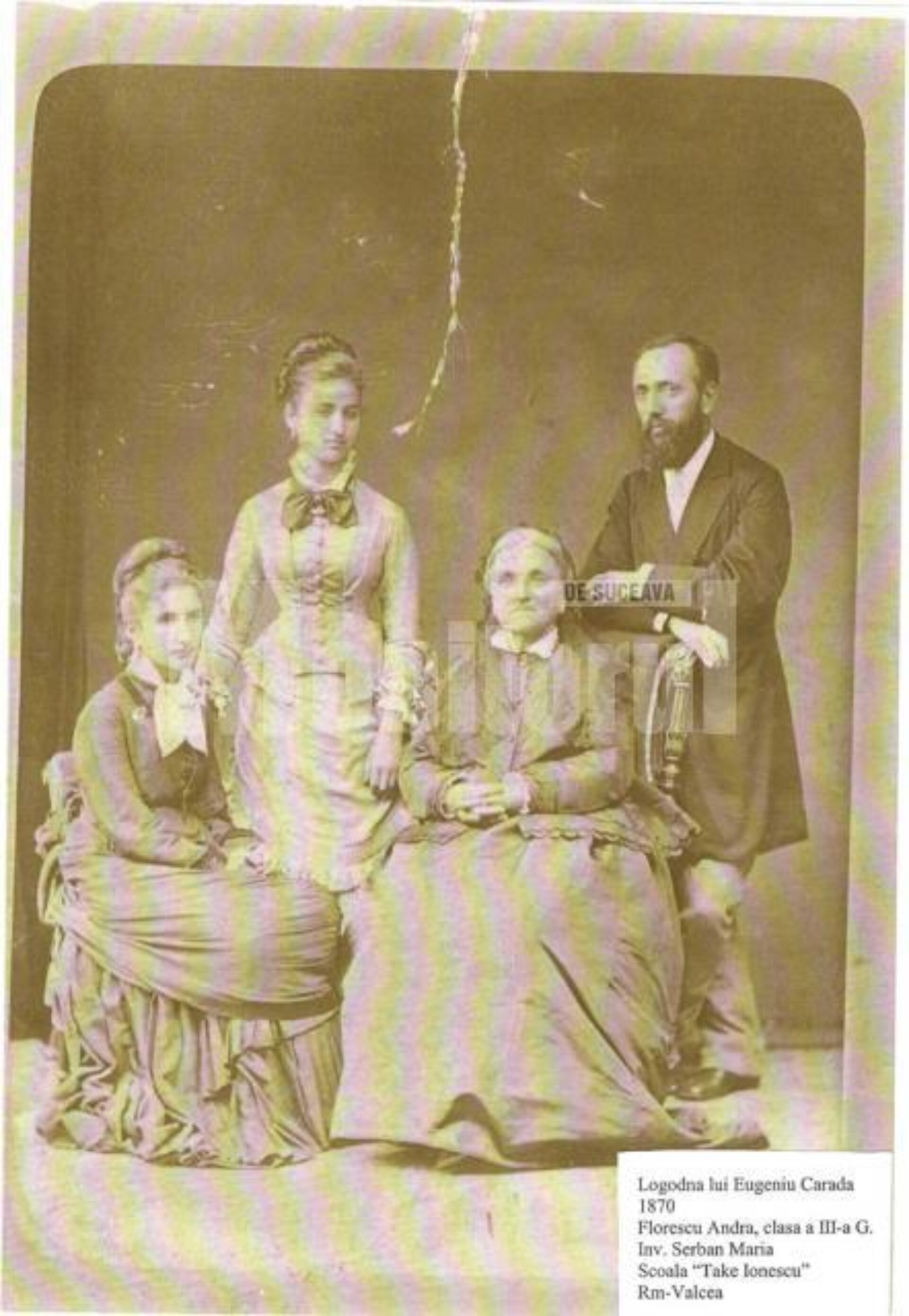 Din aceeași colecție, din care au fost expuse mai multe fotografii document, era și cea prezentată de eleva Andra Florescu de la școala susmenționată, o fotografie din anul 1870 de la logodna publicistului și economistului Eugeniu Carada (colaborator la gazetele “Timpul” și “Românul”), unul dintre cei care a contribuit la înființarea Băncii Naționale a României.
