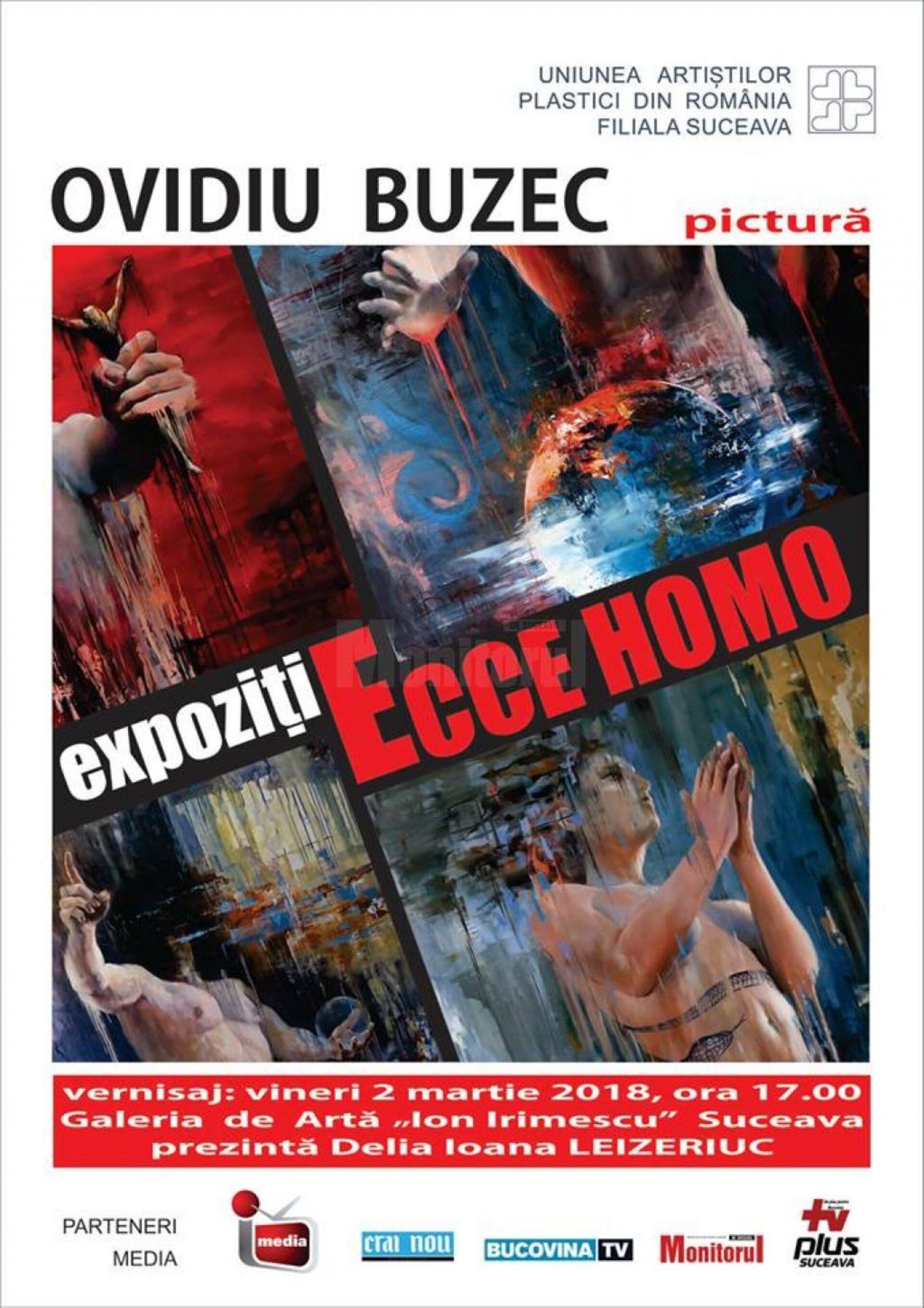 La Galeria de Artă „Ion Irimescu” din municipiul Suceava se deschide vineri, 2 martie a.c., la ora 17.00, expoziția de pictură cu genericul „Ecce Homo”, a artistului plastic Ovidiu Buzec. Expoziția, organizată de Uniunea Artiștilor Plastici din România – Filiala Suceava, va fi prezentată la vernisaj de Delia Ioana Leizeriuc.