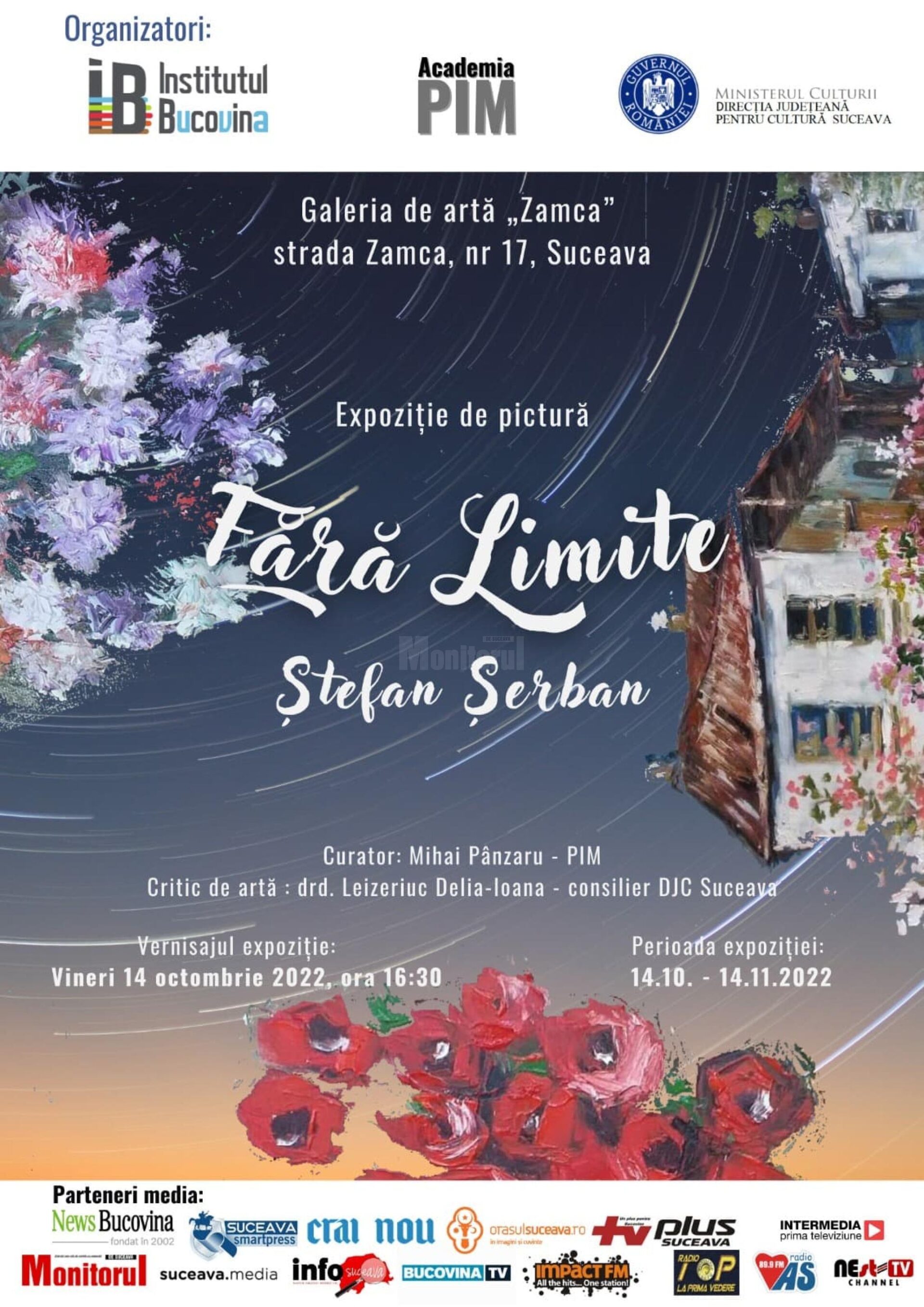 La Galeria de artă „Zamca” va avea loc vineri, 14 octombrie, de la ora 16:30, vernisajul Expoziției de pictură „Fără Limite”, semnată de Ștefan Șerban. Curator: Mihai Pânzaru PIM. Prezentarea va fi făcută de criticul de artă drd. Delia Ioana Leizeriuc, consilier în cadrul Direcției Județene pentru Cultură Suceava. Lucrările vor sta pe simeze și vor putea fi vizitate în perioada 14 octombrie – 14 noiembrie 2022. Acțiunea este organizată de Institutul Bucovina, Academia PIM și Direcția Județeană pentru Cultură Suceava.