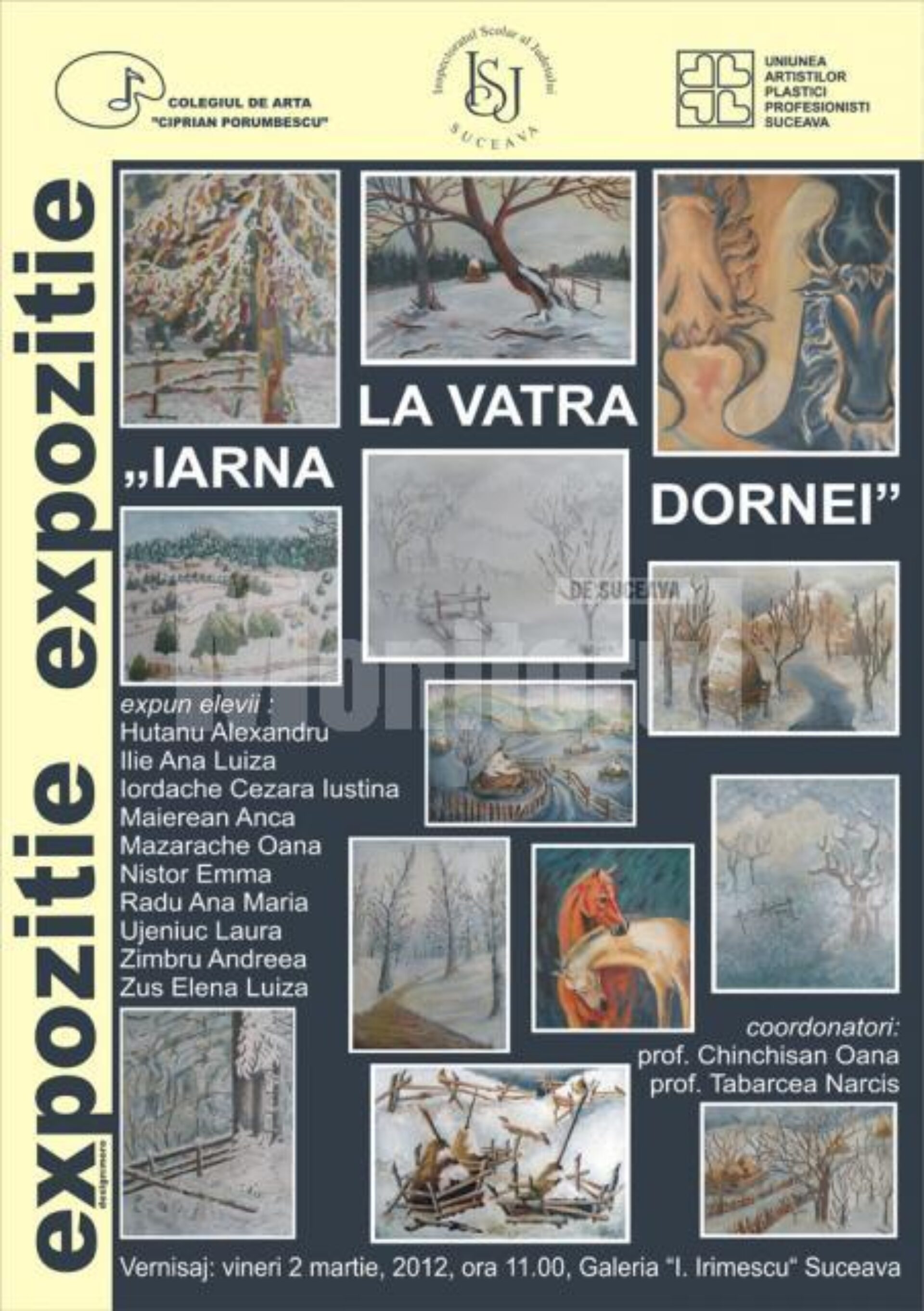 Expoziția etalează lucrări ale elevilor claselor a XI-a B și a XII-a B, de la Colegiul de Artă „Ciprian Porumbescu” Suceava, realizate în tabăra de creație de la Vatra Dornei, activitate organizată în luna decembrie 2011 de Inspectoratul Școlar Județean (IȘJ) Suceava.