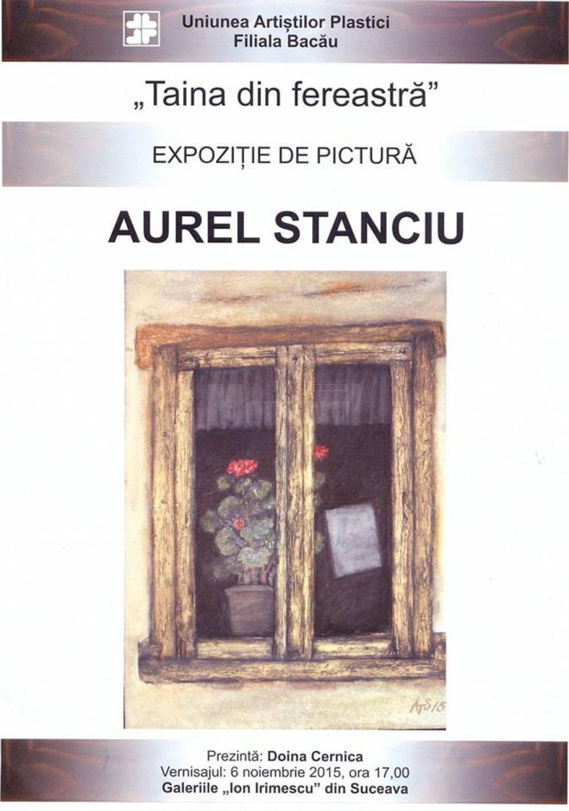 La Galeria de Artă „Ion Irimescu” din municipiul Suceava se deschide vineri, 6 noiembrie a.c., la ora 17.00, expoziția personală de pictură cu genericul „Taina din fereastră”, a pictorului Aurel Stanciu, membru al Uniunii Artiștilor Plastici din România – Filiala Bacău.Aurel Stanciu a întemeiat în 1970, împreună cu Ștefan Pristavu, Mihai Butnaru și Mihai Semenov grupul „Penelul alb”, care a debutat cu o primă expoziție în foaierul Teatrului Dramatic „George Bacovia” din Bacău, a inițiat grupul Artist Trading Cards și s-a ocupat de organizarea unor tabere de creație.Ferestrele lui Aurel Stanciu sunt deschideri spre cunoaștere. Necunoscutul, noul, devine cunoscut privind prin fereastră. Artistul este impresionat de amintirile din copilărie, de frumusețea fațadelor și a interioarelor caselor țărănești. Studiind structurile naturale și stăpân pe regulile compoziției plastice, a calităților și cantităților coloristice, plasticianul creează structuri, materialități și expresivități noi.Prezintă scriitoarea și jurnalista Doina Cernica.