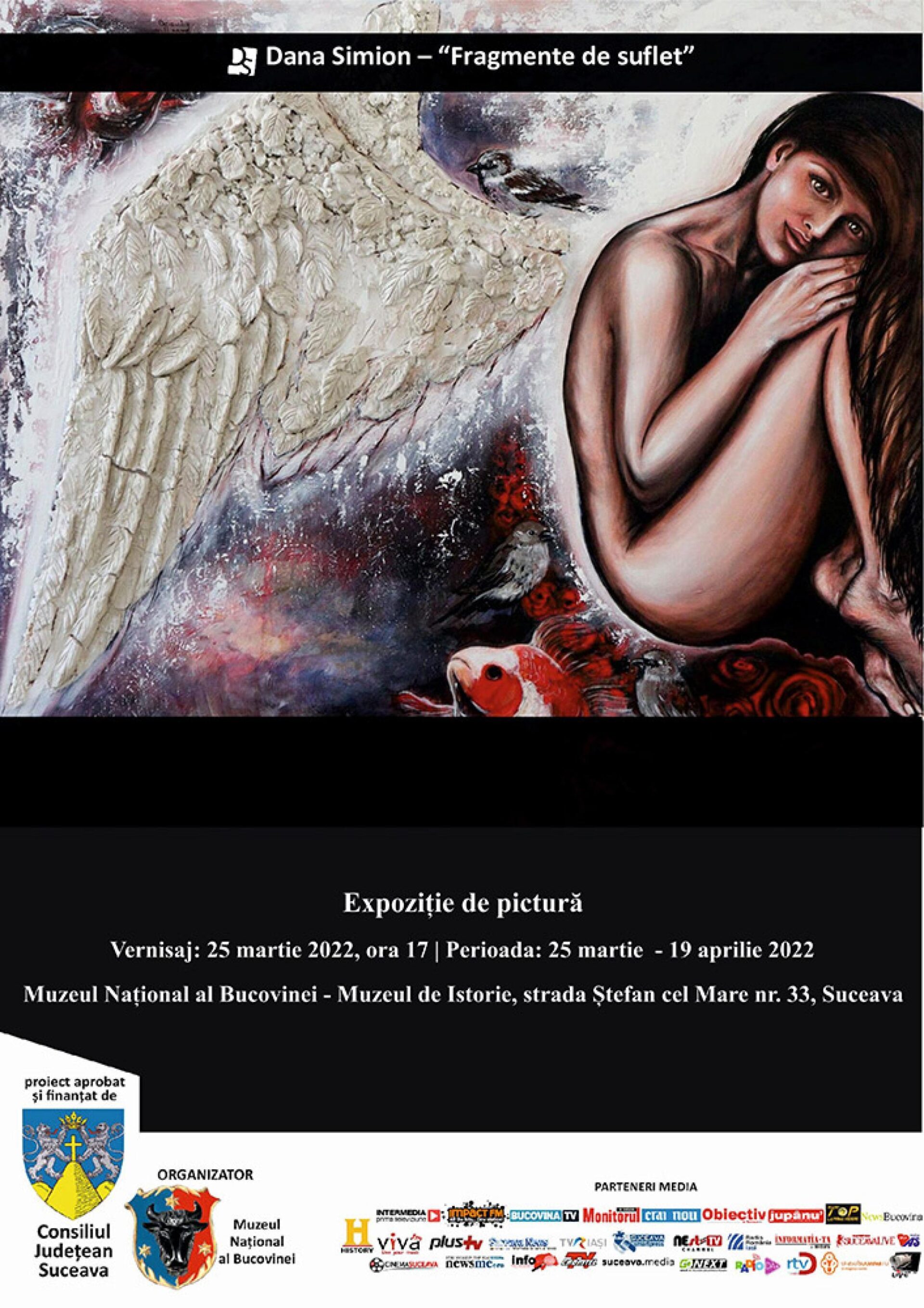 La Muzeul de Istorie Suceava va putea fi vizitată, în perioada 25 martie – 19 aprilie 2022, expoziția „Fragmente de suflet” semnată de artistul plastic sucevean Dana Simion. Vernisajul expoziției va avea loc pe 25 martie, la ora 17:00. Expoziția aduce în prim-plan figura umană și dorește să repună în dezbatere valoarea esteticii și a frumosului în cadrul artei contemporane.