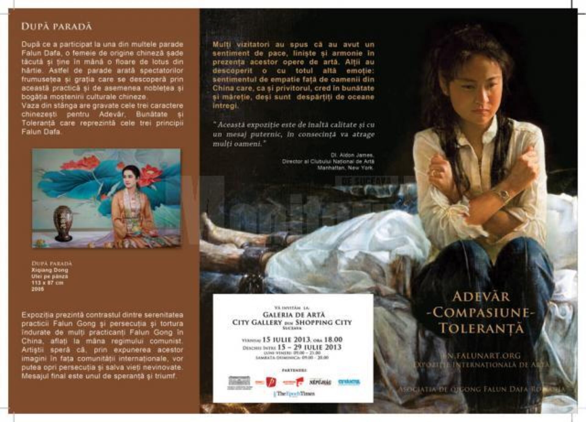 La City Gallery, în incinta Shopping City Suceava, s-a deschis, la începutul acestei săptămâni, expoziția internațională de artă cu genericul „Adevăr – Compasiune – Toleranță”, o manifestare vizuală care transmite un puternic mesaj pentru susținerea practicanților Falun Gong, persecutați de regimul comunist chinez.