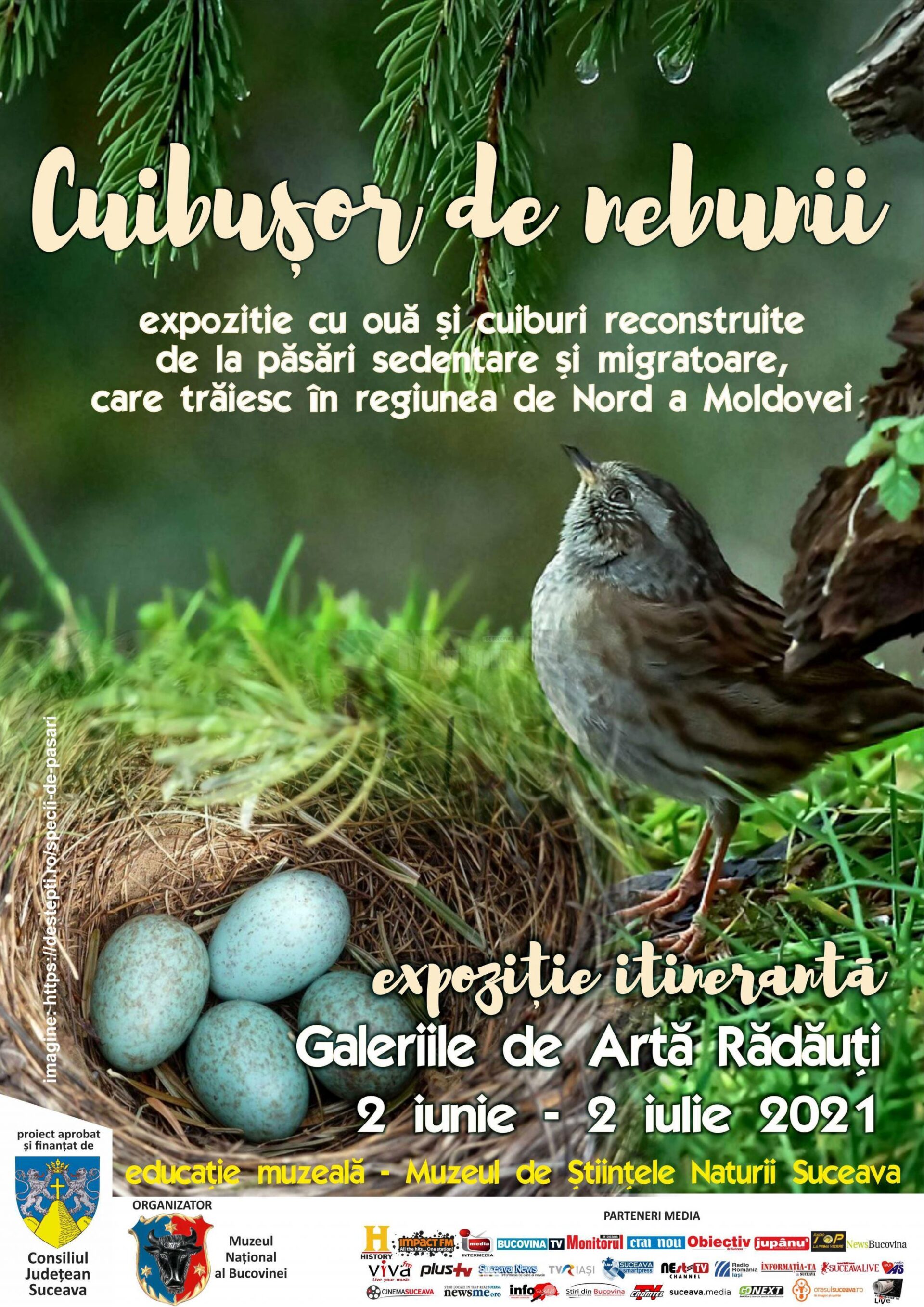Muzeul de Științele Naturii din Suceava, componentă a Muzeului Național al Bucovinei, organizează, în perioada 2 iunie – 2 iulie 2021, la Galeriile de Artă din Rădăuți, expoziția itinerantă „Cuibușor de nebunii”. În cadrul expoziției sunt prezentate 55 de exponate, reprezentate de cuiburi și ouă de la păsări sedentare și migratoare din nordul Moldovei.