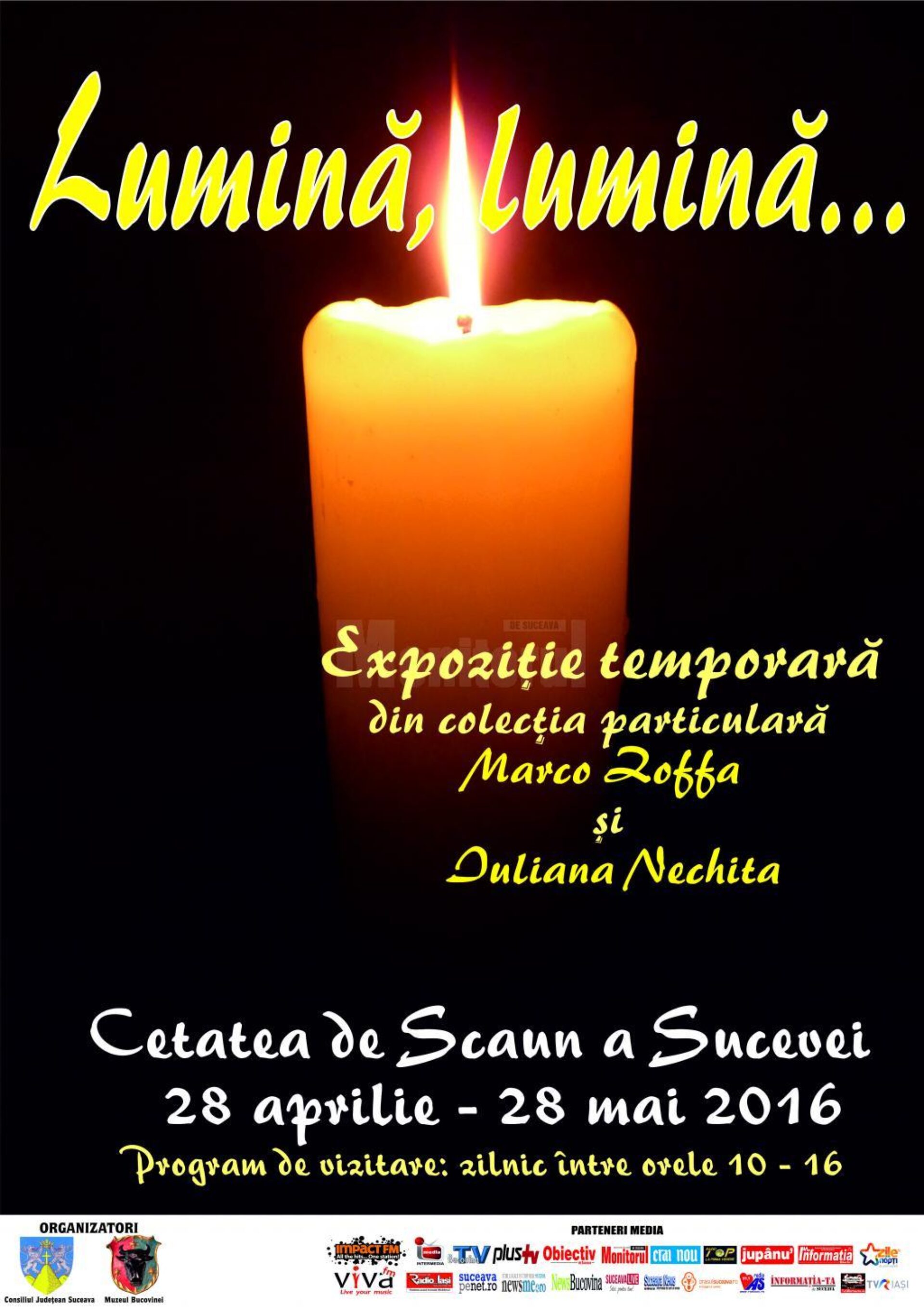 Muzeul Bucovinei deschide joi, 28 aprilie, la ora 12.00, în paraclisul Cetății de Scaun a Sucevei, expoziția temporară cu genericul „Lumină, lumină…”, realizată de muzeograful Gabriel Marcel Catrinar și coordonată de Corina Ignat, cu obiecte din colecția particulară a familiei Marco Zuffa și Iuliana Nechita. Expoziția cuprinde peste 100 de obiecte din secolele XVII-XX, care provin din diferite regiuni ale Europei și din spațiul asiatic.