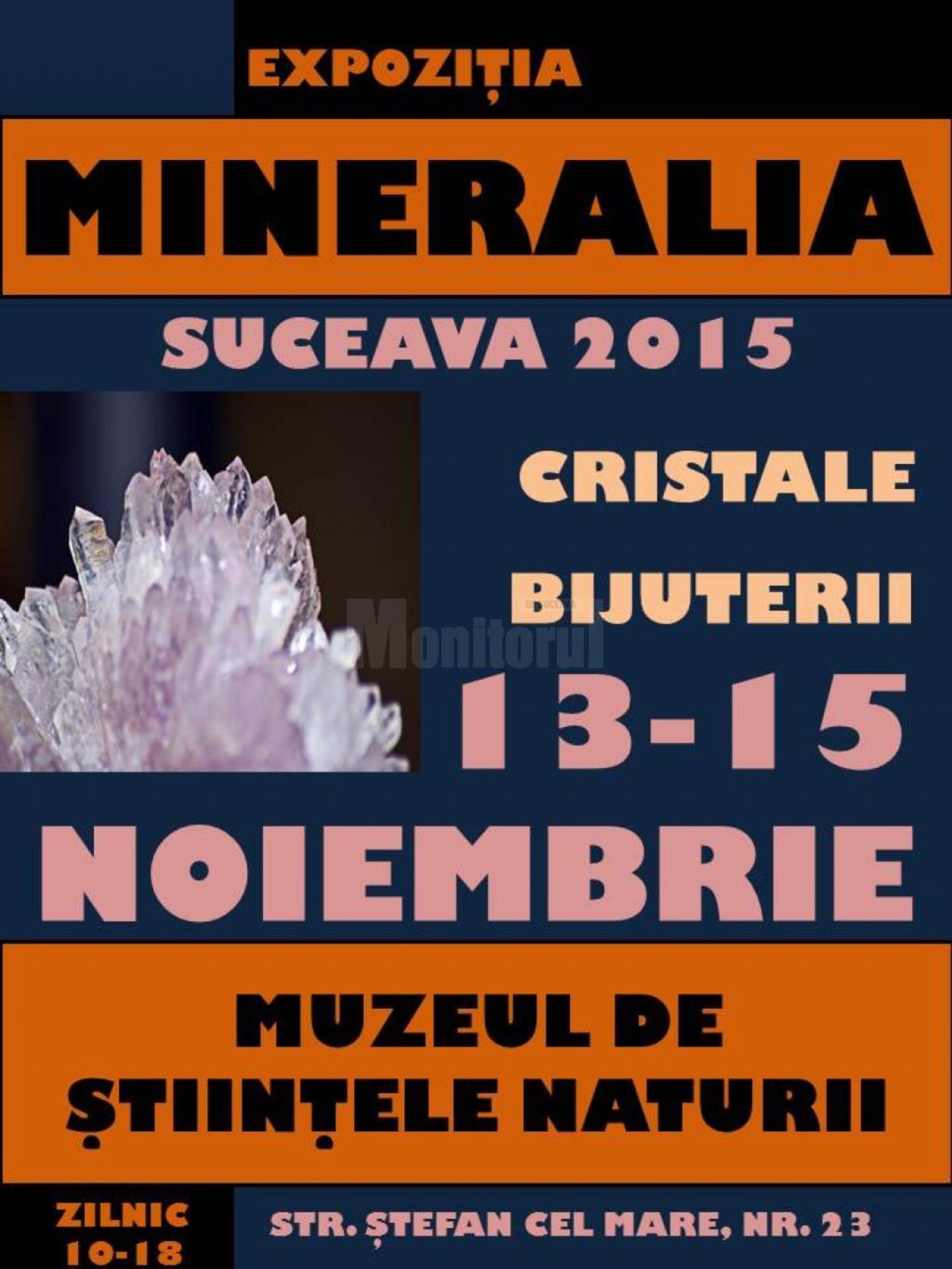 La Muzeul de Științele Naturii din municipiul Suceava se deschide vineri, 13 noiembrie a.c., la ora 12.00, ediția de toamnă a expoziției „Mineralia”, dedicată cristalelor, podoabelor și bijuteriilor din pietre prețioase. Un eveniment cu tradiție pentru orașul Suceava, o expoziție „strălucitoare”, în care sunt prezentate obiecte și bijuterii care au ca numitor comun piatra. Cristale, minerale, fosile sau geme – toate în stare naturală, obiecte decorative din piatră șlefuită, eșantioane de colecție, bijuterii din coral, perle sau chihlimbar, podoabe confecționate în întregime din pietre semiprețioase (ametist, calcedonie, agat, jad, lapis, malachit, turmalină, turcoaz) sau prețioase (rubin, smarald, safir, diamant).Expoziția cu vânzare, prezentată în intervalul 13 – 15 noiembrie, poate fi vizitată zilnic între orele 10.00 – 18.00.
