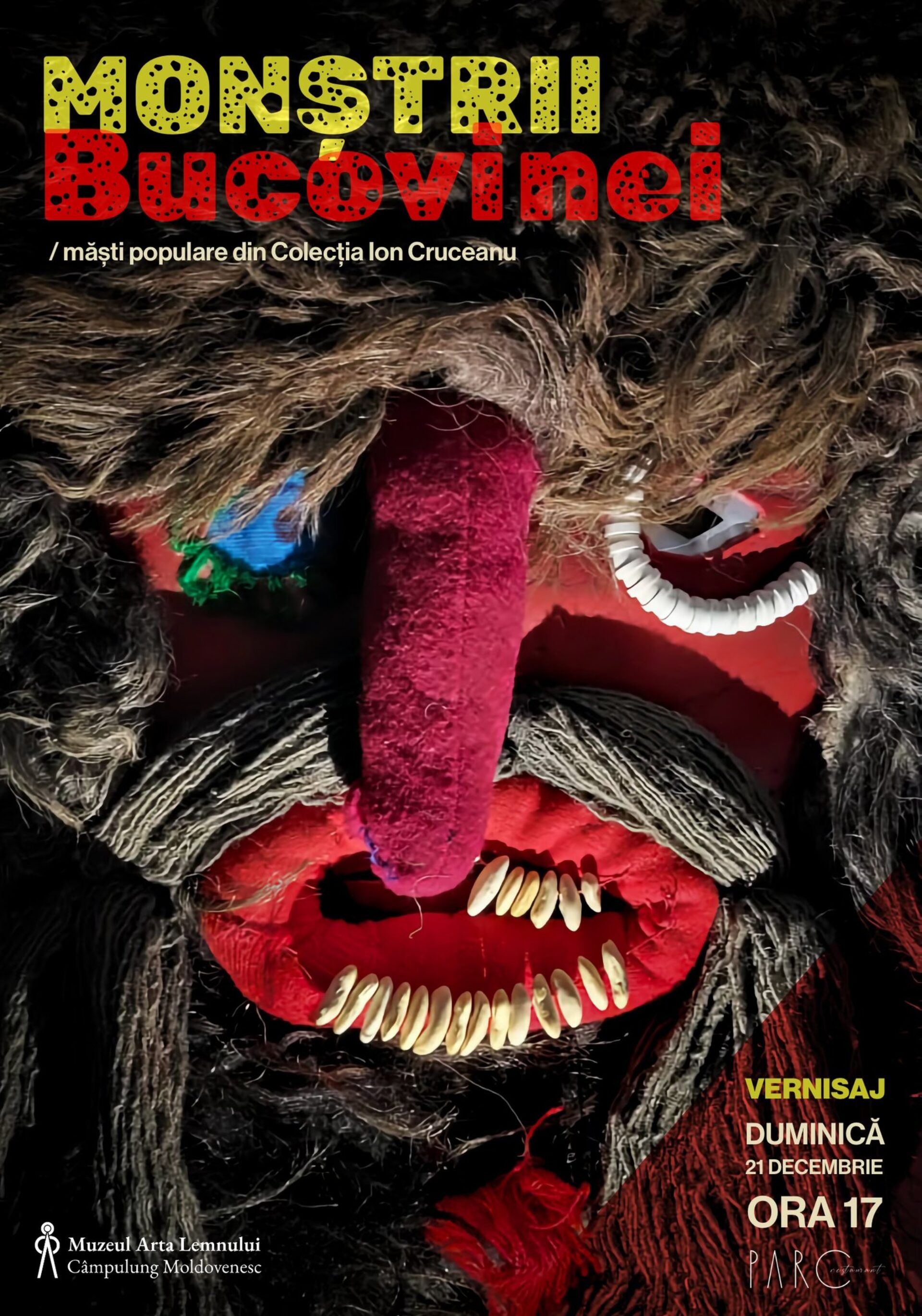 Muzeul Arta Lemnului din Câmpulung Moldovenesc organizează duminică, 21 decembrie 2025, de la ora 17:00, vernisajul unei expoziții care aduce în fața publicului una dintre cele mai spectaculoase și profunde expresii ale imaginarului popular bucovinean, expoziția „Monștrii Bucovinei”. Această expoziție este dedicată măștilor de Anul Nou realizate și colecționate de prof. muzeograf Ion Cruceanu (1946–2016) din Vatra Dornei.
