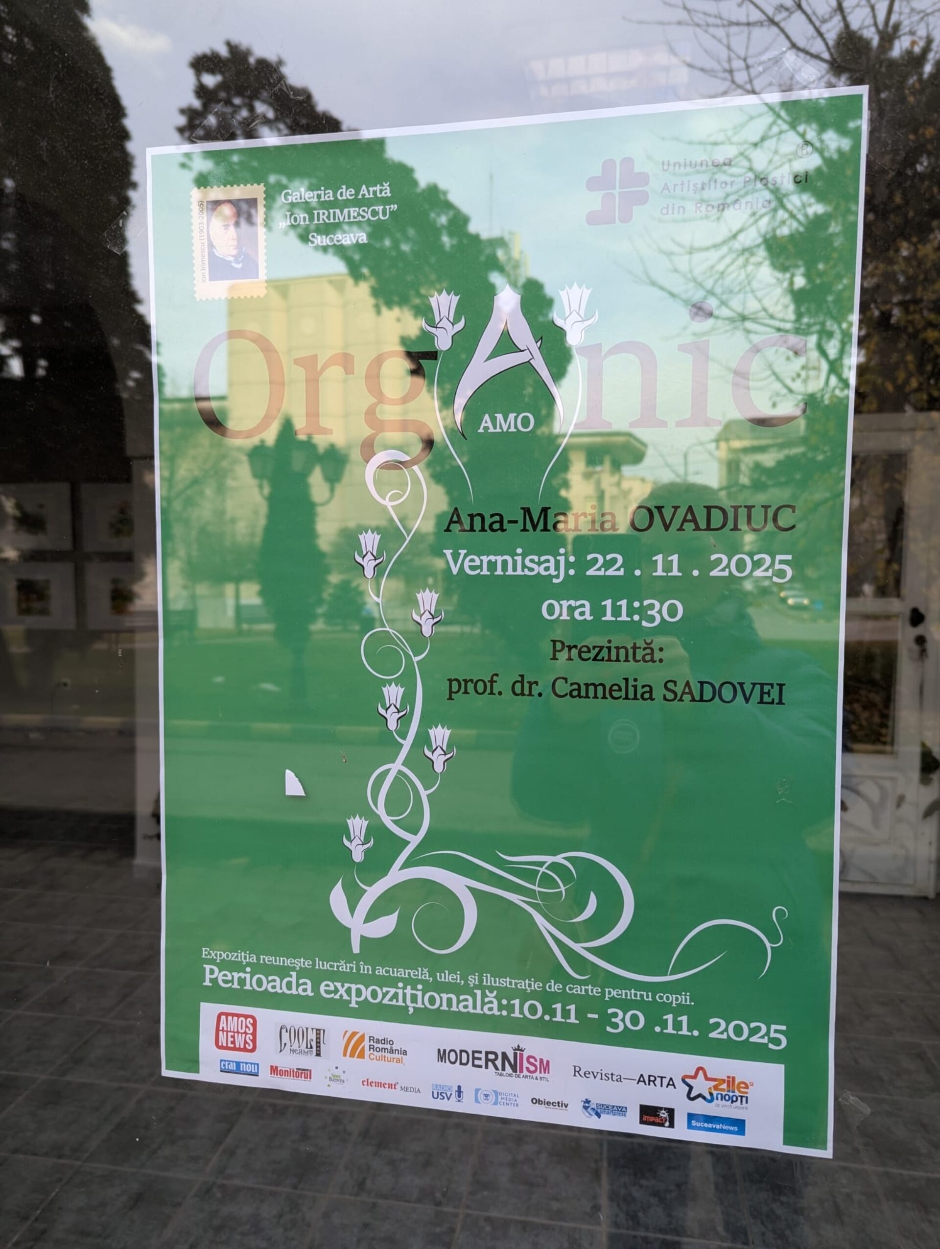 La Galeria de Artă „Ion Irimescu” Suceava va avea loc sâmbătă, 22 noiembrie 2025, la ora 11:30, vernisajul expoziției „Organic”, realizată de Ana-Maria Ovadiuc AMO, președinta Asociației de Artă Nicolae Tonitza, Universitatea „Ștefan cel Mare” (Suceava).