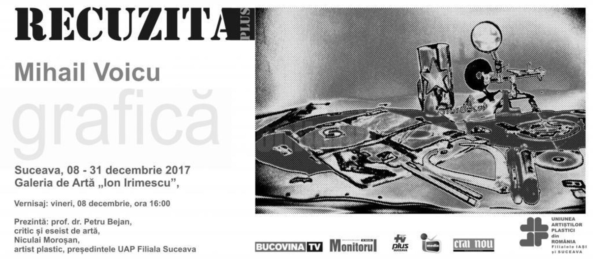 Galeria „Ion Irimescu” Suceava găzduiește, în perioada 8-31 decembrie, expoziția „Recuzita.Plus”, prima expoziție de autor la Suceava a graficianului Mihail Voicu. Va fi expusă o selecție de 25 de piese executate în tehnici specific graficii -gravură sau grafică de șevalet. Majoritatea lucrărilor au un caracter retro/introspectiv, unele aparținând unor cicluri tematice mai vechi (2013), precum și unor cicluri mai noi de creatie (2015-2017) – MegaFonie, Simetrie subiectivă, Jurnal nocturn sau Aqua. Vernisajul expoziției are loc vineri, 8 decembrie, la ora 16,00. Prezintă prof. dr Petru Bejan, crtitic și eseist de artă, și Niculai Moroșan, artist plastic, președintele UAP, filiala Suceava.