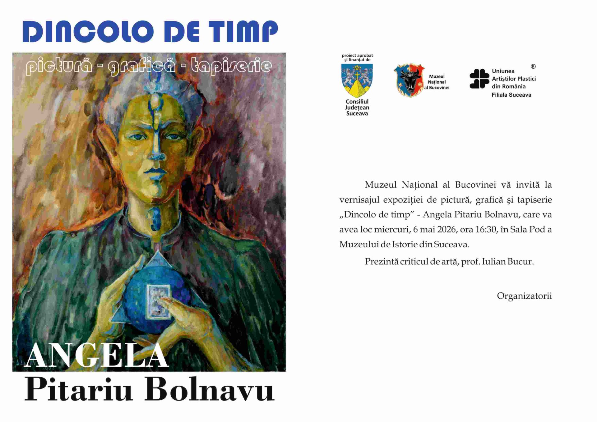 În spațiul expozițional al Sălii Pod de la Muzeul de Istorie va avea loc, miercuri, 6 mai 2026, la ora 16:30, vernisajul expoziției retrospective „Dincolo de timp”, dedicată artistei Angela Pitariu Bolnavu (1956–2013), o personalitate remarcabilă a scenei artistice locale. Prezintă criticul de artă prof. Iulian Bucur.