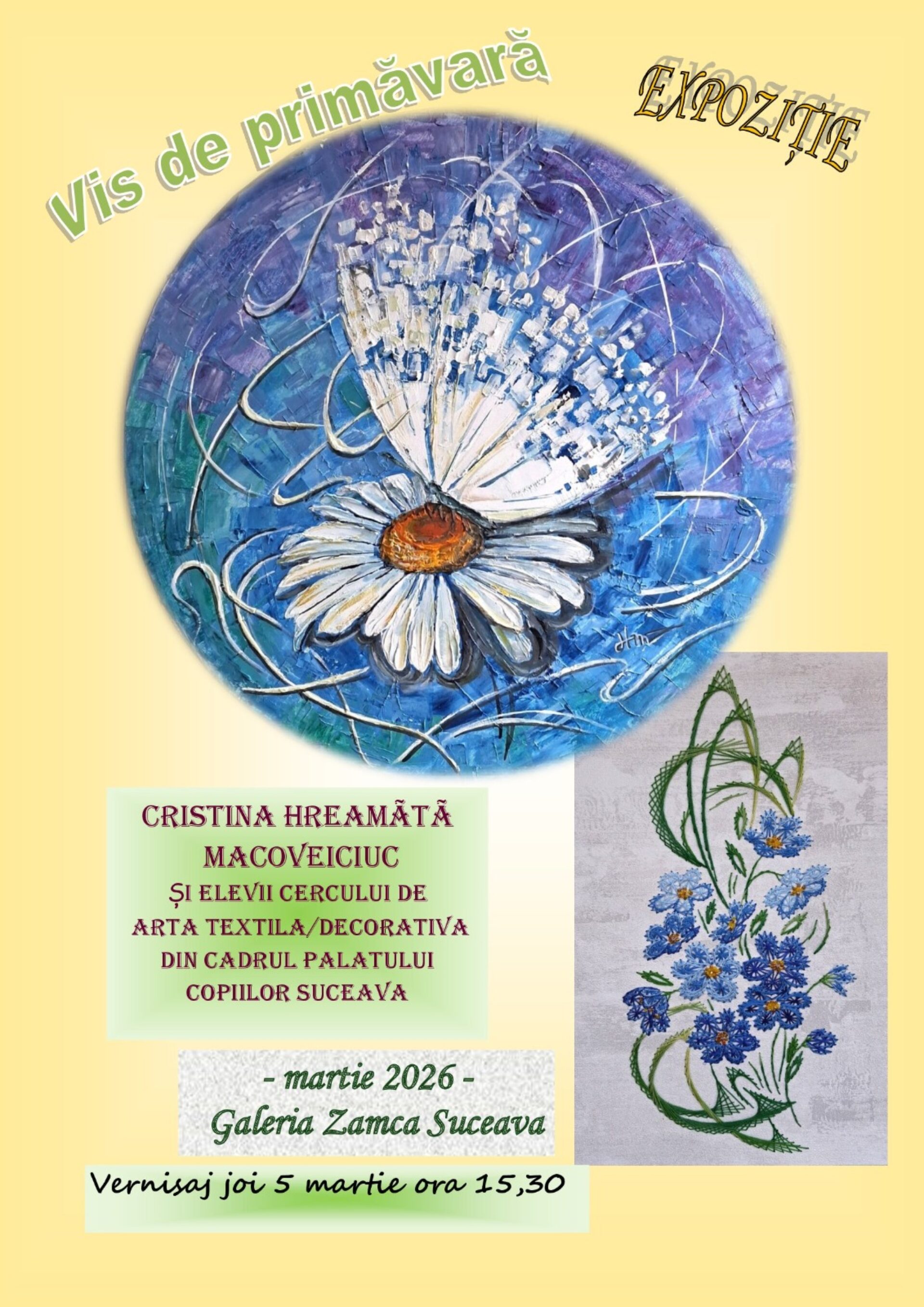 La Galeria de Artă Zamca va avea loc joi, 5 martie 2026, de la ora 15:30, vernisajul expoziției „Vis de primăvară”, în care sunt expuse lucrări realizate de copii de la Cercul de artă textilă/decorativă de la Palatul Copiilor Suceava, cerc de artă ce este coordonat de prof. Cristina Hreamătă-Macoveiciuc.