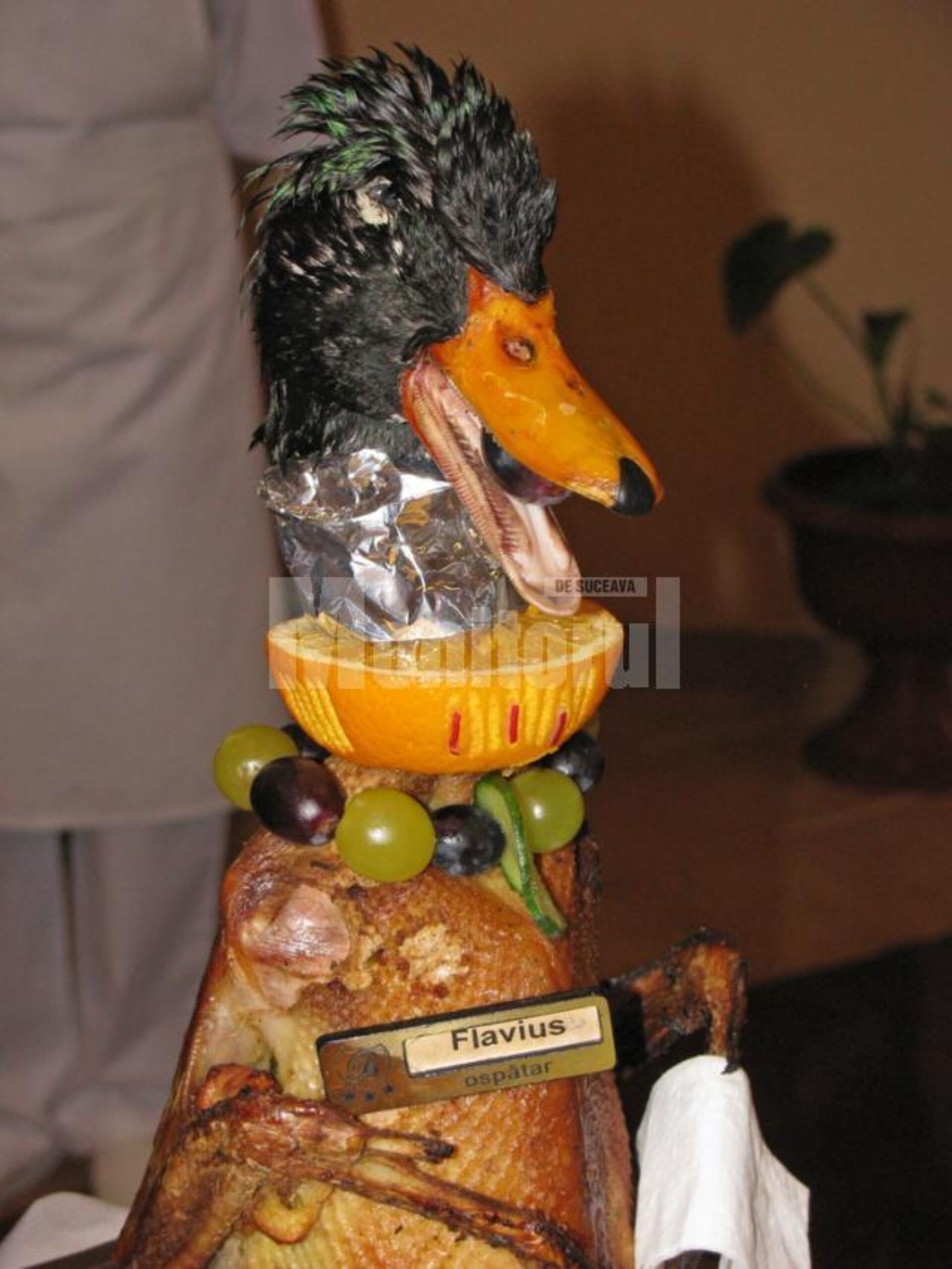 Vedete ale expoziției culinare câmpulungene au devenit imediat în ochii publicului Flavius Rață, Porcone și Nea Melu, fiecare fiind un fel de general impunător peste câte o armată de platouri cu bunătăți, secondați de coloneii Peștache și frații Prepeluși, în fruntea unor divizii specializate pe nișe de produse. De fapt, Flavius Rață a fost un falnic rățoi fript, etalat amuzant în postură de ospătar, cu propria ”freză” și cu ecuson regulamentar în dotare. De imaginea personajului se pare că s-a ocupat cu multă inventivitate unul dintre angajații restaurantului, care i-a împrumutat chiar prenumele și ecusonul propriu ca să-l ajute pe favoritul lui să avanseze în ”cariera” culinară.