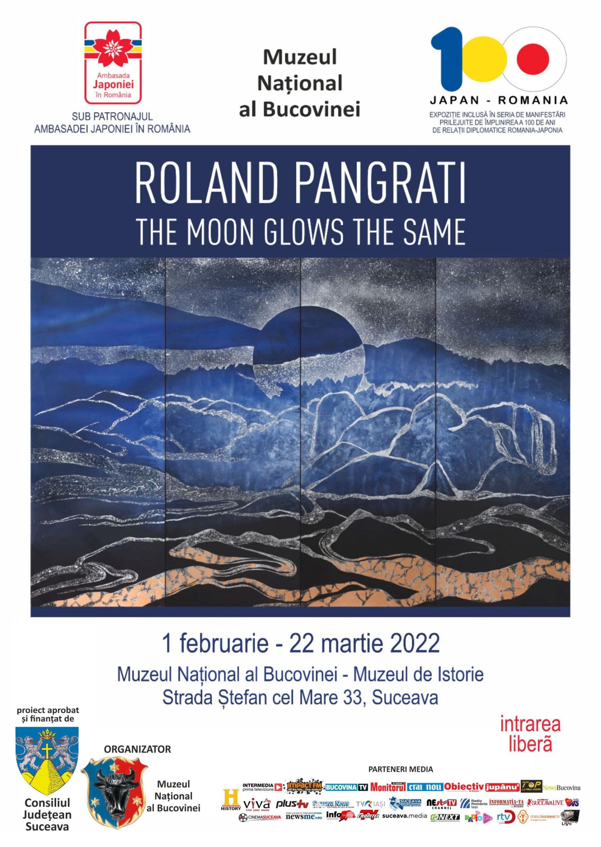 La Muzeul de Istorie Suceava va avea loc marți, 1 februarie 2022, la ora 13:00, vernisajul expoziției de artă vizuală „The Moon Glows the Same”, semnată de artistul român Roland Pangrati. Evenimentul este organizat de Muzeul Național al Bucovinei. Expoziția „beneficiază de patronajul Ambasadei Japoniei la București și este inclusă în seria de manifestări dedicate împlinirii unui secol de relații diplomatice între România și Japonia”, spun organizatorii.
