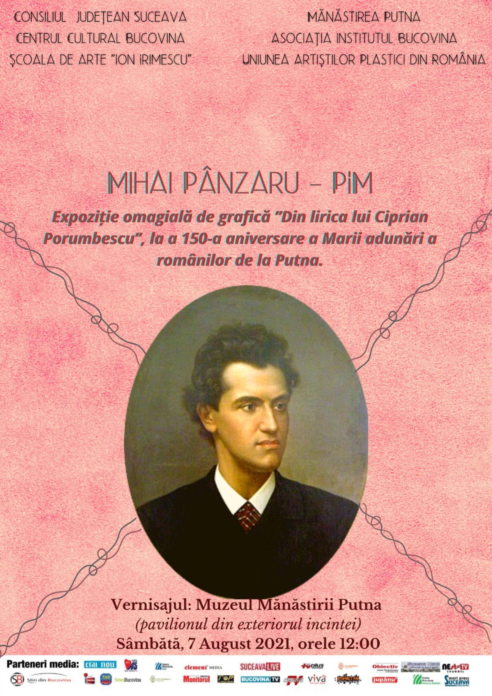 La Muzeul Mănăstirii Putna (pavilionul din exteriorul incintei) va avea loc sâmbătă, 7 august, la ora 12:00, vernisajul expoziției omagiale de grafică „Din lirica lui Ciprian Porumbescu”, semnată de maestrul Mihai Pânzaru PIM, „la a 150-a aniversare a Marii adunări a românilor de la Putna”.