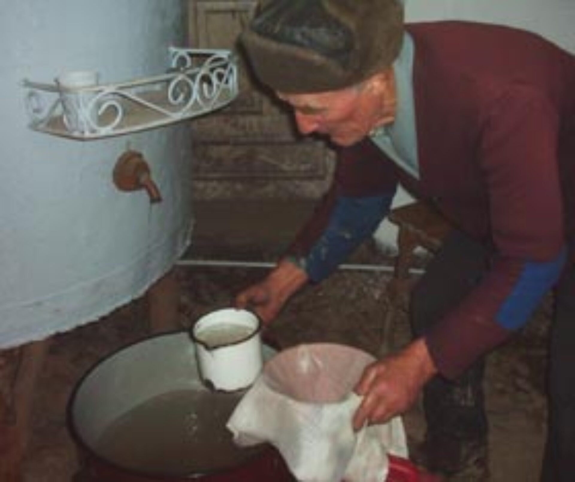 După coborârea primei scări care duce spre beciul în care este amenajată complexa instalație, un puternic miros de rachiu proaspăt te lovește instantaneu. Proprietarii cazanului, Gheorghe și fiul său, supraveghează cu atenție procesul tehnologic, în timp ce clienții așteaptă cuminți „finalitatea” fierberii, odihnindu-se pe cele două paturi amplasate în cămăruță și trăgând cu coada ochiului la programele de la televizorul montat în colțul încăperii. Într-una alt colț al beciului, chiar sub unul din cazane, tronează o tobă, la care din când în când nea Ghiță mai susține, spre deliciul celor prezenți, câte un recital. „Aici te îmbeți numai dacă intri, fără să mai bei nimica”, spune amuzat un bărbat venit să-și facă provizii de rachiu pentru iarnă. Deși ar putea să plece la casele lor și să se întoarcă să-și ia marfa, clienții preferă să rămână la fața locului, atât din cauza distanței de la care vin, dar și datorită atmosferei care îi încântă. „Stăm aici la nea Ghiță de plăcere, supraveghem cum merge treaba, mai bem un rachiu, mai zicem o poantă, nu e rău”, spune un bărbat venit și el cu o comandă