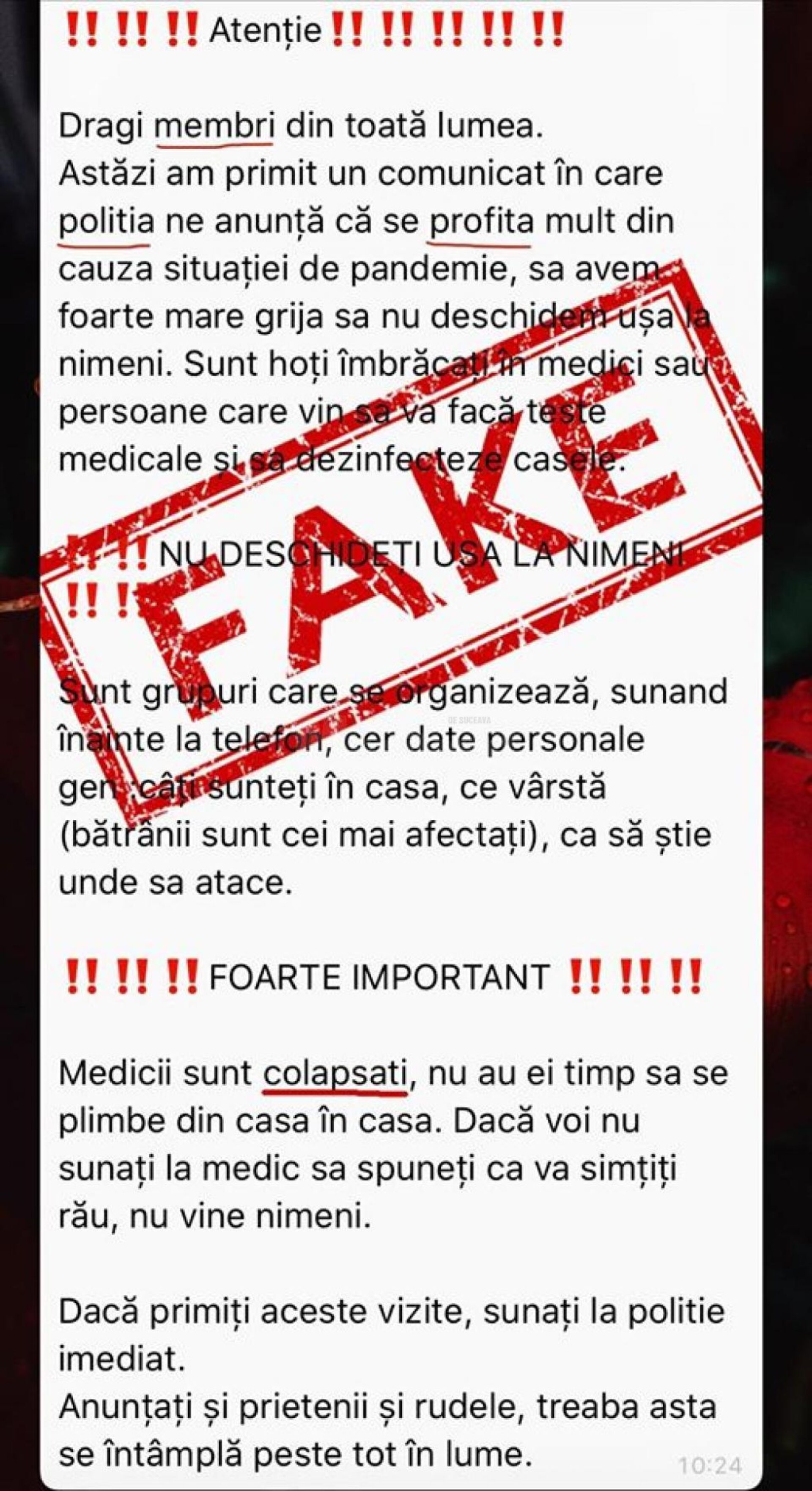 ”‼‼‼Atenție‼‼‼‼‼ Dragi mămici și bunici din toată lumea. Astăzi am primit un comunicat în care politia ne anunță că se profita mult din cauza situației de pandemie, sa avem foarte mare grijă să nu deschidem ușa la nimeni. Sunt hoți îmbrăcați în medici sau persoane care vin sa va facă teste medicale și să dezinfecteze casele. ‼‼NU DESCHIDEȚI USA LA NIMENI ‼‼ Sunt grupuri care se organizează, sunând înainte la telefon, cer date personale gen: câți sunteți în casa, ce vârstă (bătrânii sunt cei mai afectați), ca să știe unde sa atace. ‼‼‼FOARTE IMPORTANT ‼‼‼ Medicii sunt colapsați, nu au ei timp sa se plimbe din casă în casă. Dacă voi nu sunați la medic sa spuneți ca va simțiți rău, nu vine nimeni. Dacă primiți aceste vizite, sunați la politie imediat. Anunțați și prietenii și rudele, treaba asta se întâmplă peste tot în lume”, așa sună acest noi fake-news.