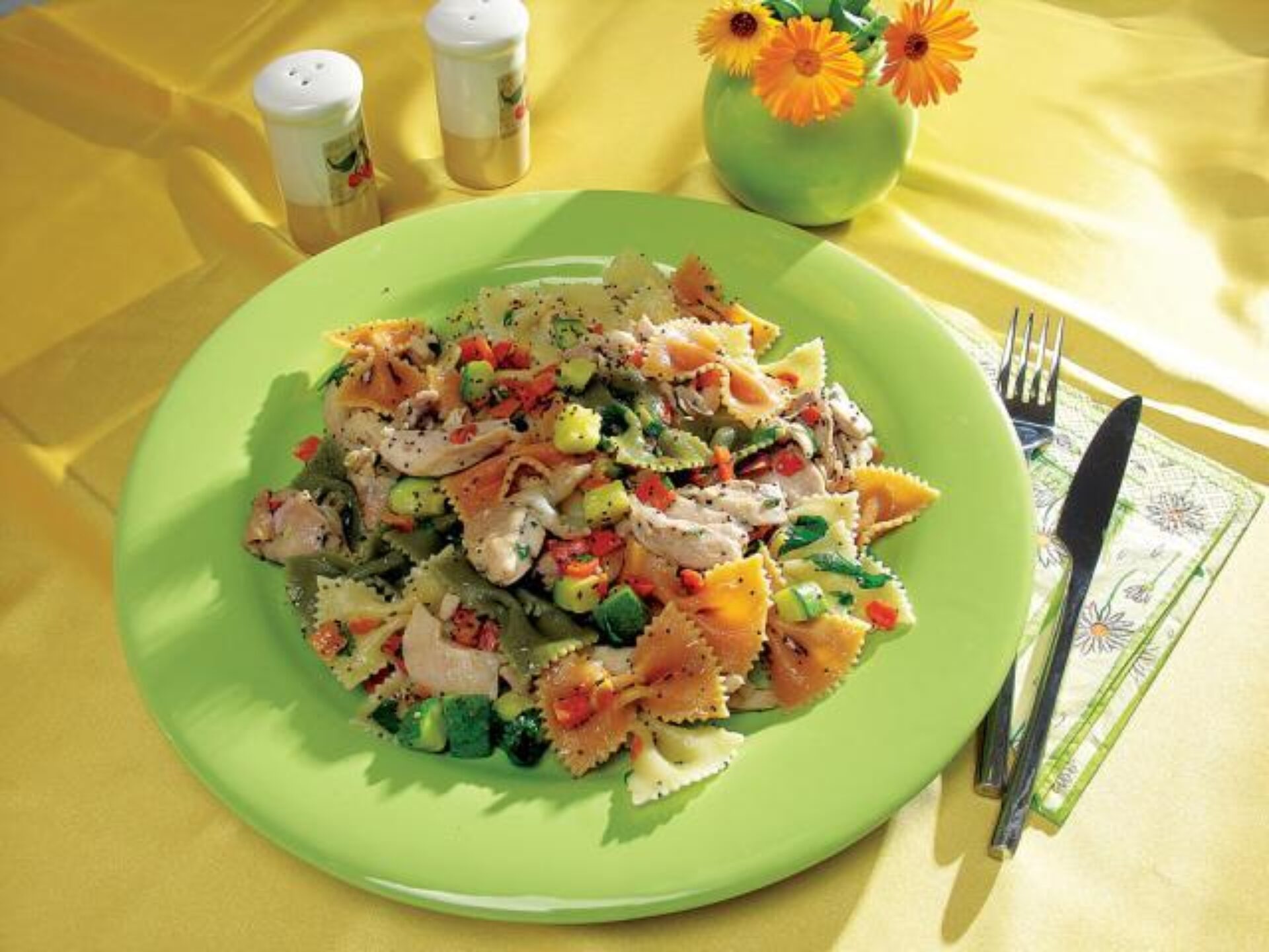 Pune pieptul de pui împreună cu morcovul, tăiat în cubulețe, la fiert în 2 l apă cu 1 linguriță sare. După 15 minute scoate-le și taie pieptul de pui în feliuțe. Între timp, pune la fiert și pastele, în 3 l apă cu 1 linguriță sare. Taie dovleceii în cubulețe și călește-i în ulei, împreună cu morcovul scurs bine de apa în care a fiert și feliuțele de piept de pui. Când acestea s-au rumenit, adaugă semințele de mac și potrivește de sare și piper. Adaugă în tigaie pastele scurse bine de apă și pătrunjelul tocat mărunt. Mai lasă la foc mic 2 minute, apoi servește pastele fierbinți, presărate pe deasupra cu parmezan ras.