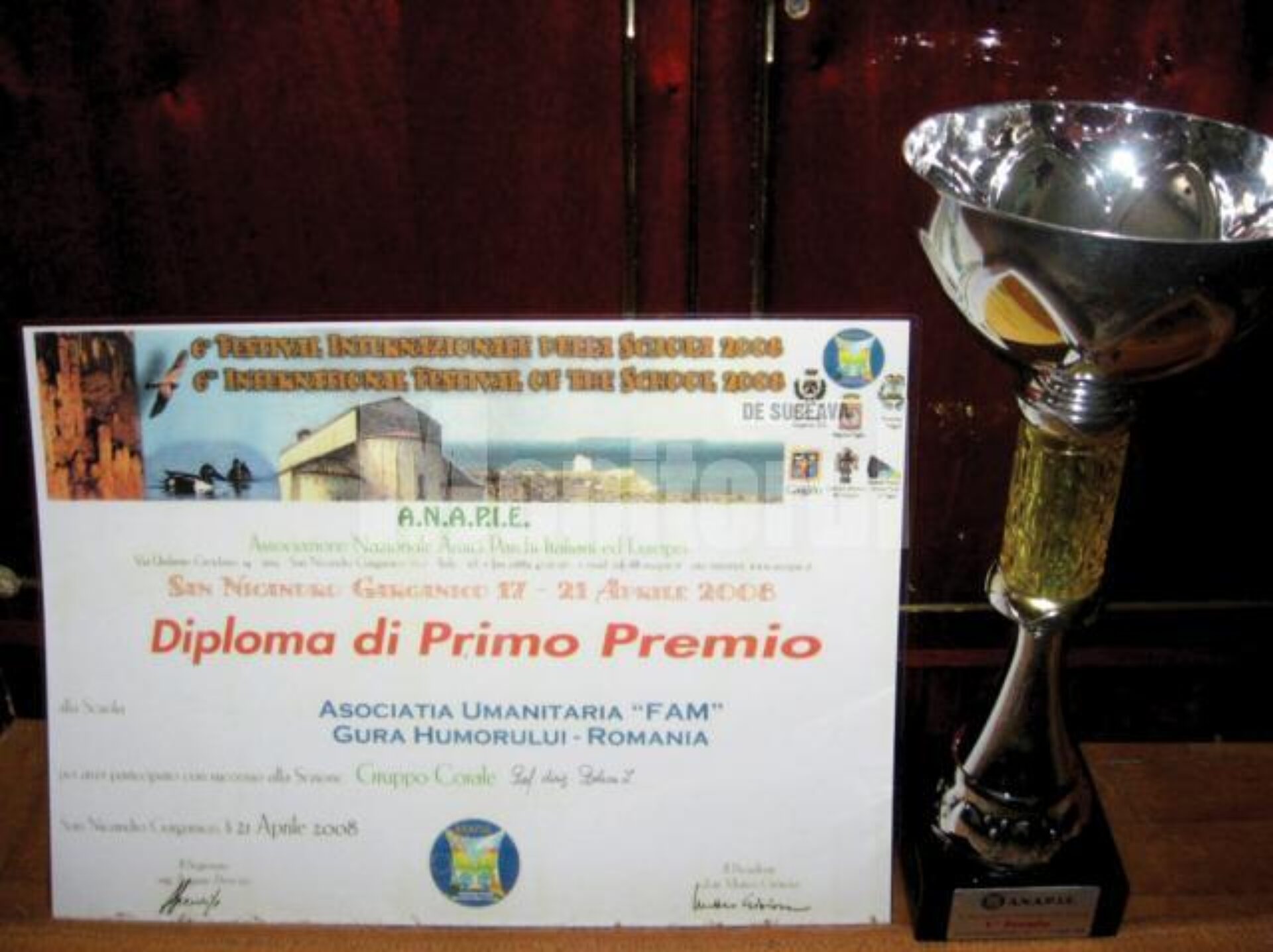 În preajma zilei copilului, conducerea Asociației Umanitare “Fam” din Gura Humorului felicită tinerele membre ale coralei “Primavera” dirijate de mâna măiastră a doamnei profesoare Lenuța Beleca, pentru Locul I și cupa obținute la cel de al VI lea Festival Internațional Școlar ce a avut loc în San Nicandro Garganico- Italia, în perioada 17-21.04.2008.