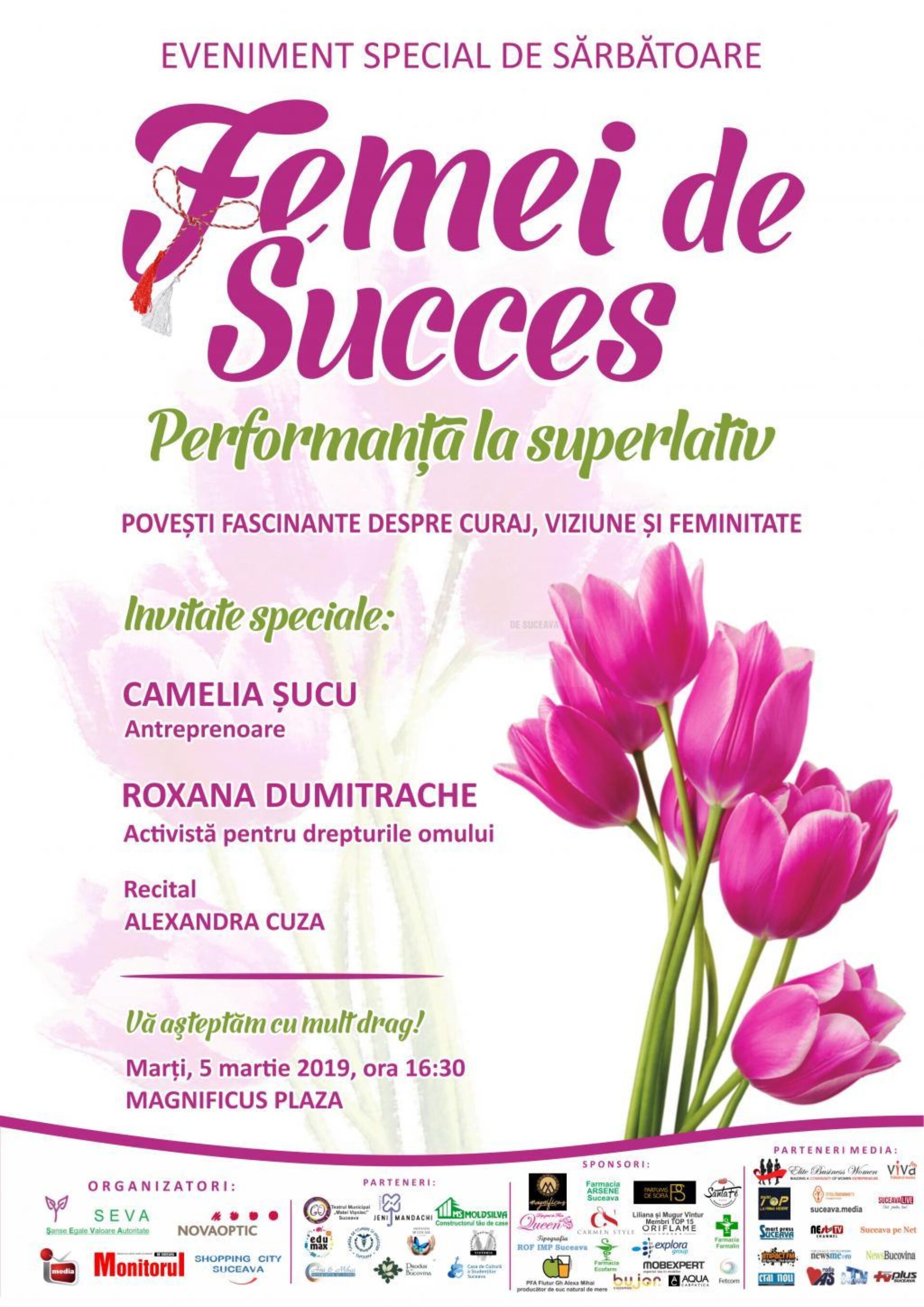 Evenimentul „Femei de succes! Performanță la superlativ!”, ediția 2019, va avea loc marți, 5 martie, la ora 16:30, la Magnificus Plaza. Invitatele speciale de anul acesta sunt Camelia Șucu, antreprenoare, și Roxana Dumitrache, activistă pentru drepturile omului. Camelia Șucu este, cu adevărat, o femeie de succes. Cu o carieră în afaceri de peste 20 ani, antreprenoarea Camelia Șucu este cunoscută pentru performanțele sale în domeniul imobiliar și design interior. Parcursul său i-a oferit experiențe diverse și constructive pe toate planurile – a fost, mai întâi, pionier și organizator al cercului de rock din școală, a învățat fizică, a lucrat în atelierul de lăcătuș-mecanic la Apaca, a absolvit Facultatea de Medicină „Carol Davila” din București și a fost medic într-un dispensar de comună. A performat, fără doar și poate, în zona de business dar cel mai mult se mândrește cu copiii și nepoții săi.Originară din Suceava, Roxana Dumitrache este absolventă de SNSPA (Școala Națională de Studii Politice și Administrative) și masterand în studii europene și filosofie politică la London School of Economics and Political Science. De-a lungul anilor, a lucrat la Comisia Europeană și a făcut practică la Ministerul de Interne al Marii Britanii, însă a hotărât să se întoarcă în țară. În prezent, Roxana lucrează în diplomație culturală, la ICR (Institutul Cultural Român), însă mărturisește că viața ei profesională are și o importantă dimensiune civică.Cele două invitate vor vorbi despre poveștile lor de succes, despre curaj, viziune și inspirație. În acest context, li se vor alătura sucevenii Cristina David, Manuela David, Sorin Avram și Ștefan Mandachi.Evenimentul are și o componentă caritabilă: participanții vor putea face donații pentru micuța Larisa, fetița care este sub tratament medical și care a rămas fără mamă, în urma unui tragic accident de circulație, petrecut în Suceava, în toamna anului trecut.„Femei de succes! Performanță la superlativ!” este un prilej de socializare și o bucurie de primăvară pentru comunitatea suceveană. Alexandra Cuza, cunoscută de publicul sucevean drept Alex Pattie, va susține un minirecital. Tânăra a impresionat cu vocea ei și juriul concursului Vocea României. Evenimentul este organizat de Asociața SEVA, Televiziunea Intermedia Suceava, Novaoptic, Shopping City Suceava, Monitorul de Suceava, alături de alți parteneri și sponsori.