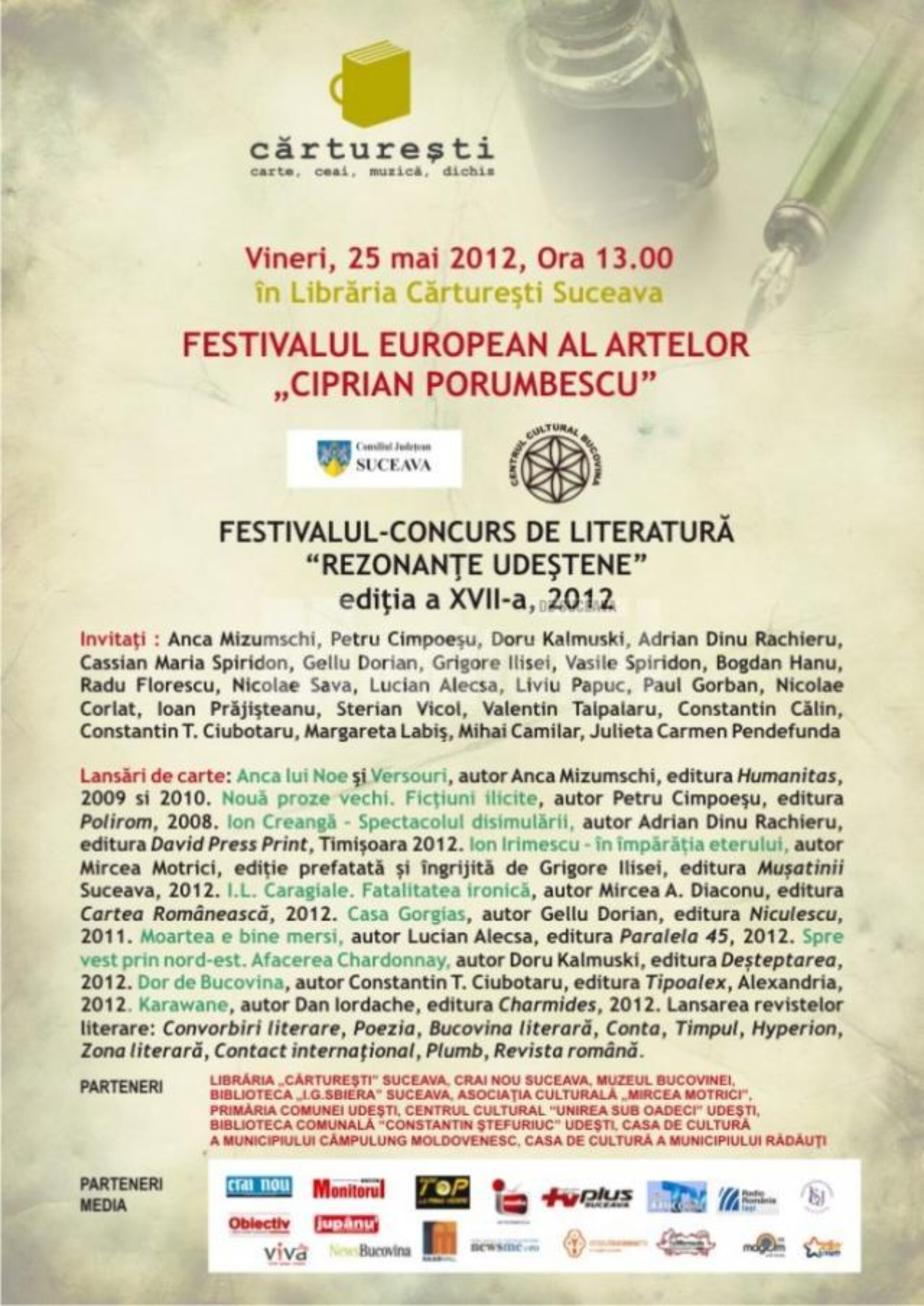 Librăria Cărturești, din incinta Iulius Mall Suceava, va găzdui vineri, 25 mai a.c., de la ora 13:00, seria lansărilor de carte din cadrul celei de-a XVII-a ediții a Festivalului-concurs de literatură „Rezonanțe udeștene”.