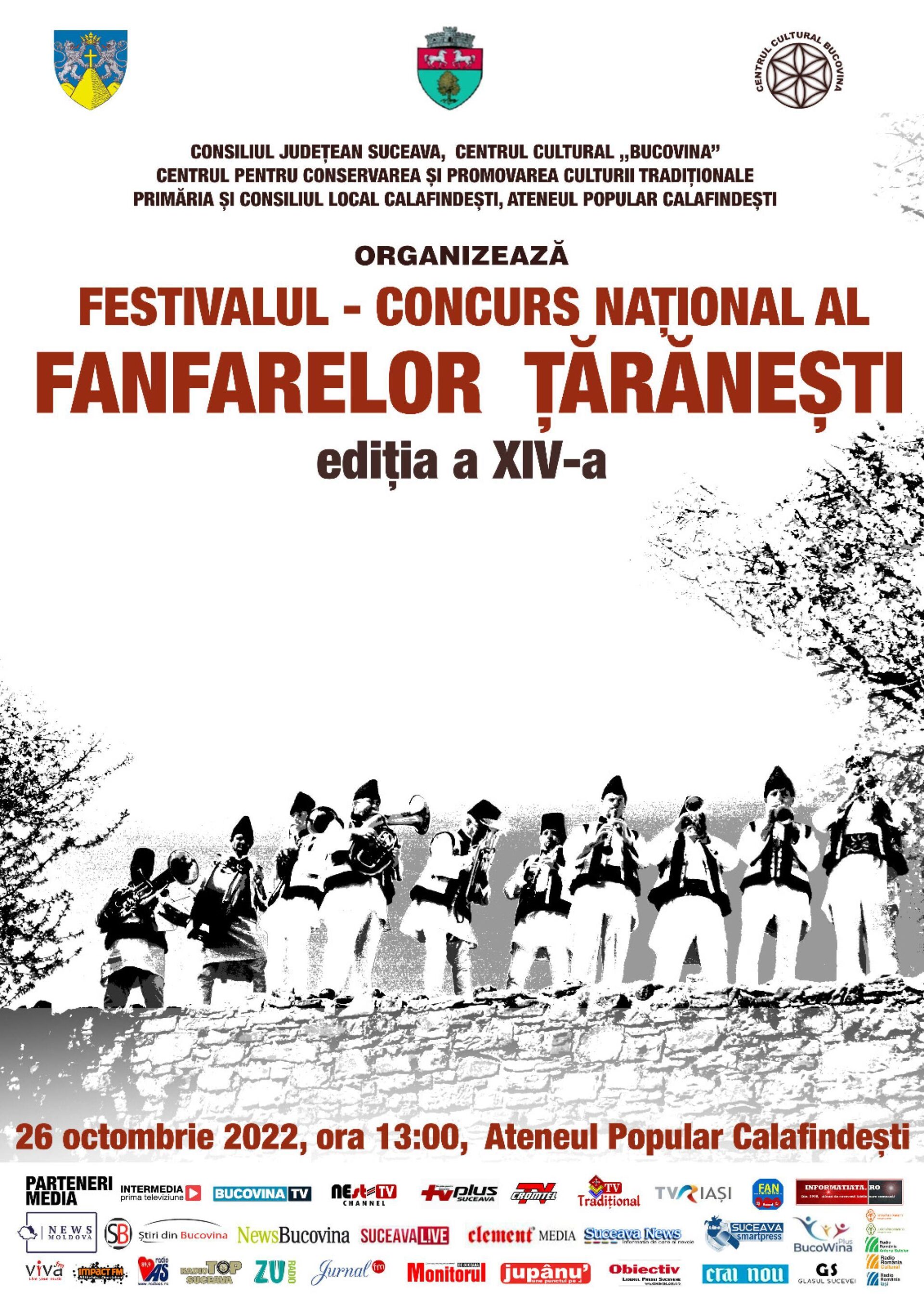 A XIV-a ediție a Festivalului-concurs național al fanfarelor țărănești va avea loc miercuri, 26 octombrie, de la ora 13.00, la Ateneul Popular din Calafindești. Evenimentul este organizat de Consiliul Județean Suceava, prin Centrul Cultural „Bucovina” – Centrul pentru Conservarea și Promovarea Culturii Tradiționale, Primăria și Consiliul Local Calafindești.