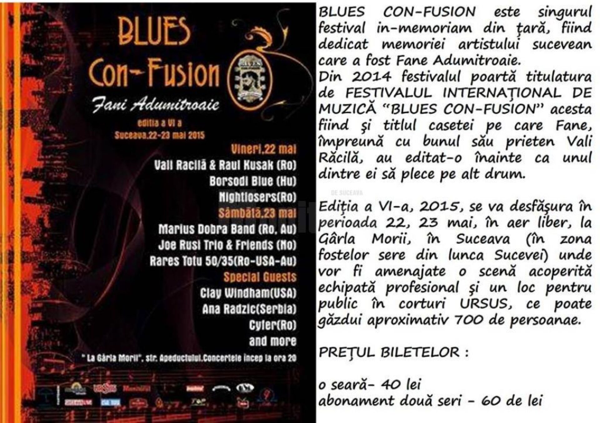 Cea de-a VI-a ediție a Festivalului internațional de muzică „Blues Con-Fusion” (singurul festival închinat memoriei unui bluesman român, suceveanul Fane Adumitroaie) se va desfășura în zilele de 22 și 23 mai a.c. la Gârla Morii (Strada Apeductului – în zona serelor din lunca râului Suceava).La ediția din acest an, care se va desfășura în aer liber (pe o scenă acoperită echipată profesional), vor concerta Vali Răcilă & Raul Kusak, Borsodi Blue, Nightlosers, Marius Dobra Band, Joe Rusi Trio & Friends, Rareș Totu 50/35, invitați speciali fiind Clay Windham, Ana Radzic, Cyter and more. Prețul biletului este de 40 de lei/seară sau 60 de lei/abonament două seri.