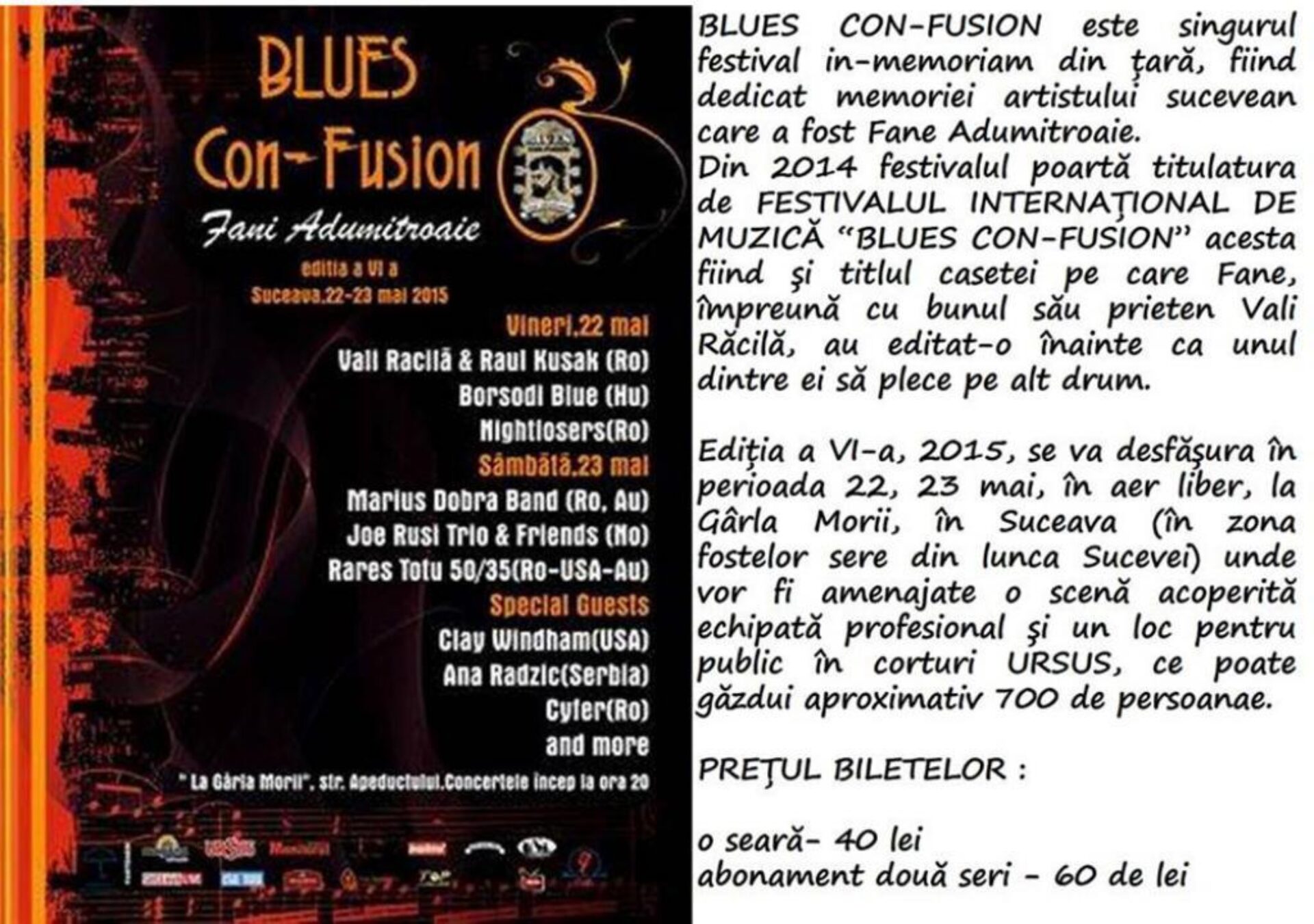 Cea de-a VI-a ediție a Festivalului internațional de muzică „Blues Con-Fusion” (singurul festival închinat memoriei unui bluesman român, suceveanul Fane Adumitroaie) se va desfășura în zilele de 22 și 23 mai a.c., la Gârla Morii (strada Apeductului – în zona serelor din lunca râului Suceava).