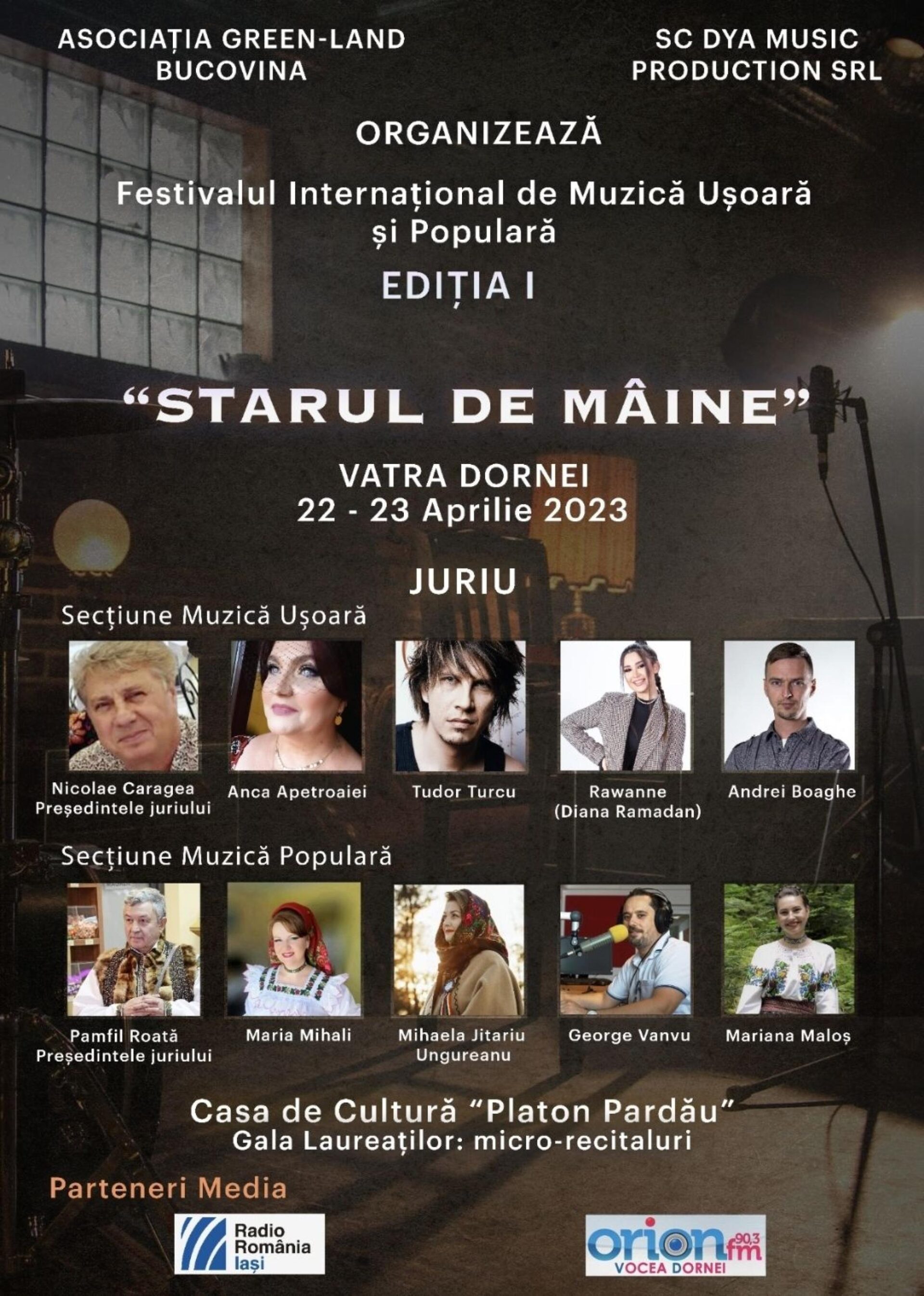 La Vatra Dornei va avea loc, în perioada 22-23 aprilie 2023, Festivalul Internațional de Muzică Ușoară și Populară „Starul de Mâine”, ediția I. Evenimentul este organizat de Asociația Green-Land Bucovina și SC DYA Music Production SRL.