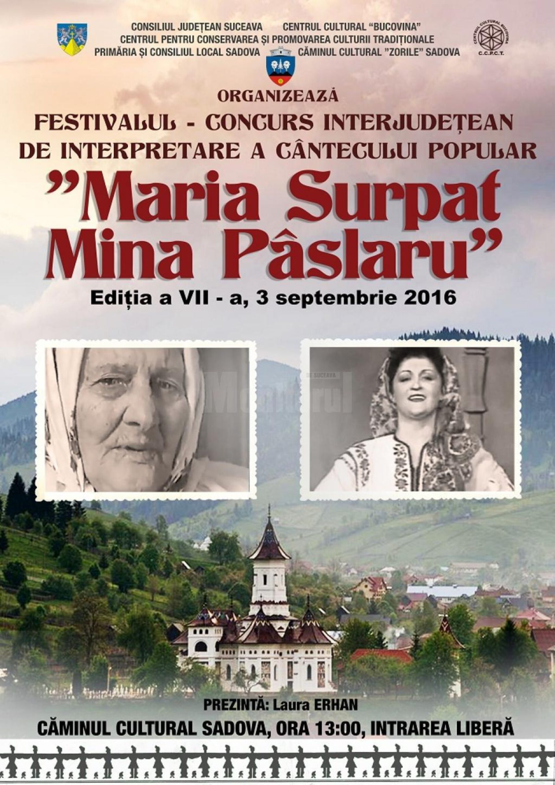 Consiliul Județean Suceava, Centrul Cultural „Bucovina” – Centrul pentru Conservarea și Promovarea Culturii Tradiționale Suceava, Primăria și Consiliul Local Sadova și Căminul Cultural „Zorile” Sadova organizează sâmbătă și duminică, 3-4 septembrie a.c., cea de-a VII-a ediție a Festivalului-concurs interjudețean de interpretare a cântecului popular „Maria Surpat – Mina Pâslaru” și Ziua Comunei Sadova – ediția a IV-a.