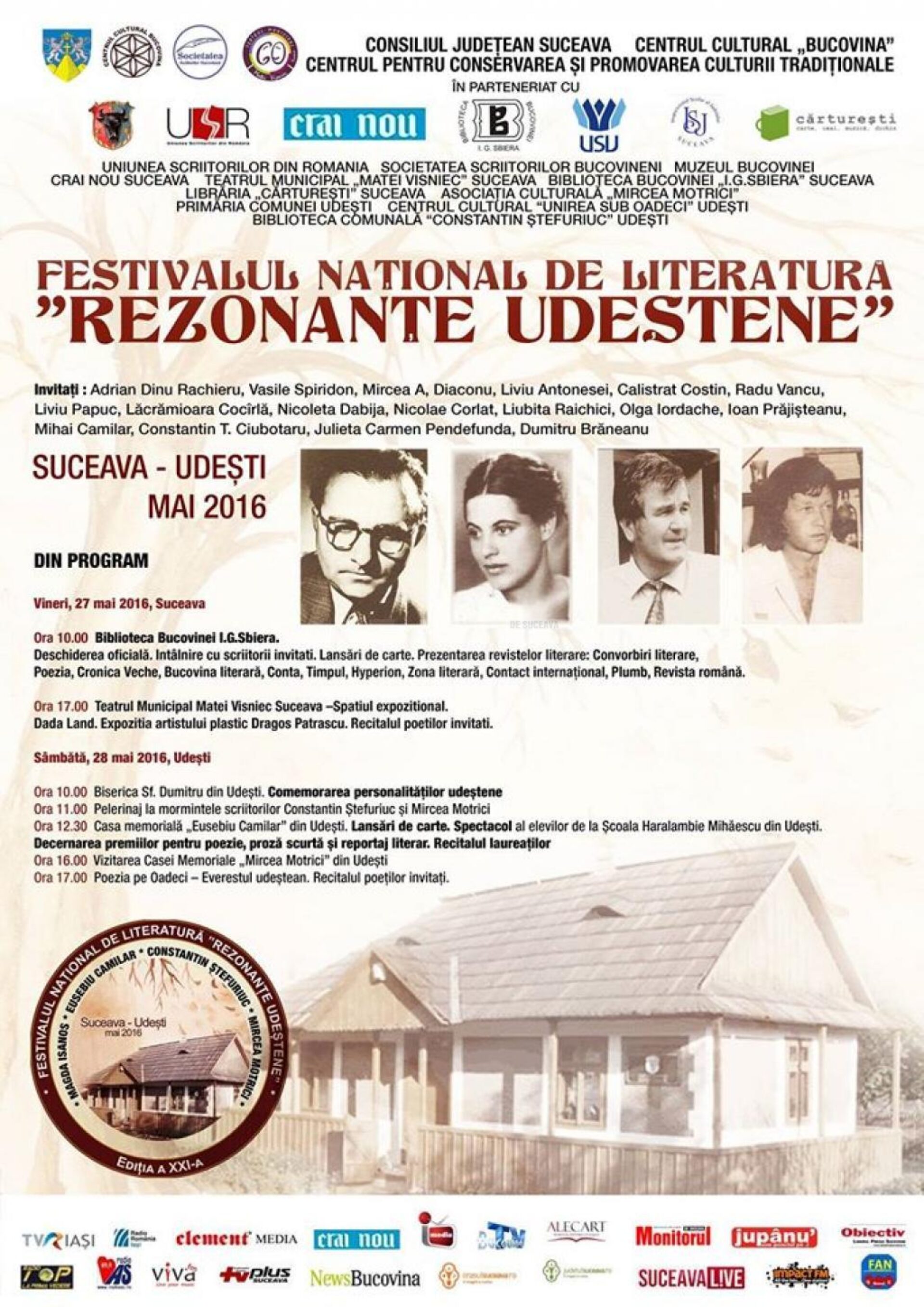 Consiliul Județean Suceava, Centrul Cultural Bucovina – Centrul pentru Conservarea și Promovarea Culturii Tradiționale, în colaborare cu Uniunea Scriitorilor din România, Societatea Scriitorilor Bucovineni, Muzeul Bucovinei, Crai Nou Suceava, Teatrul Municipal „Matei Vișniec” Suceava, Biblioteca Bucovinei „I.G. Sbiera”, Librăria „Cărturești” Suceava, Asociația Culturală „Mircea Motrici”, Primăria comunei Udești, Centrul Cultural „Unirea sub Oadeci” Udești și Biblioteca Comunală „Constantin Ștefuriuc” Udești, organizează în perioada 27 – 28 mai a.c., la Suceava și Udești, cea de-a XXI-a ediție a Festivalului Național de Literatură „Rezonanțe Udeștene”.
