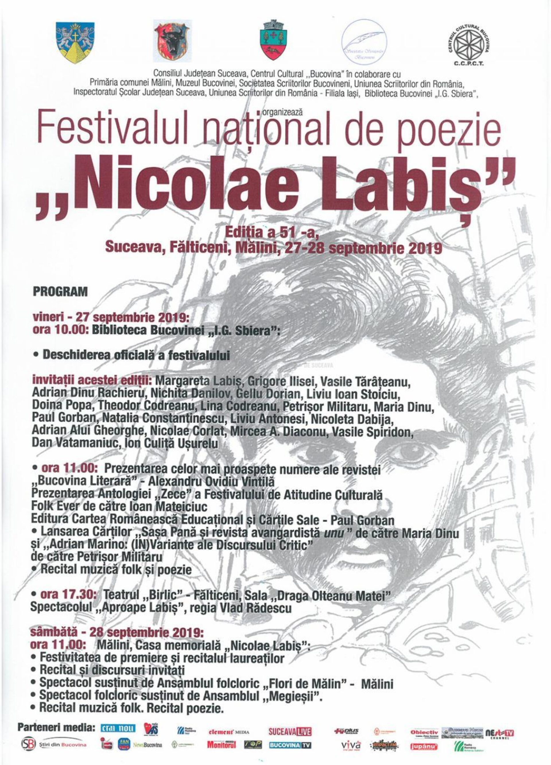 Festivalul național de poezie „Nicolae Labiș”, ediția a 51-a, va avea loc, în perioada 27 – 28 septembrie, la Suceava, Fălticeni, Mălini. Programul festivalului este următorul: 27 septembrie: ora 10:00, Biblioteca Bucovinei I. G. Sbiera – Suceava – Deschiderea oficială a festivalului; ora 11:00, Biblioteca Bucovinei I. G. Sbiera – Suceava – Prezentare Bucovina Literară realizată de Alexandru Ovidiu Vintilă. Prezentarea antologiei Zece a festivalului de atitudine culturală Folk Ever de către Ioan Mateiciuc. Editura Cartea Românească Educațional și Cărțile Sale-Paul Gorban. Lansarea cărților Sașa Pană și revista avangardistă unu de Maria Dinu și Adrian Marino: (IN)Variante ale Discursului Critic de Petrișor Militaru; la ora 17:30, Centrul Cultural Grigore Vasiliu Birlic (Fălticeni)