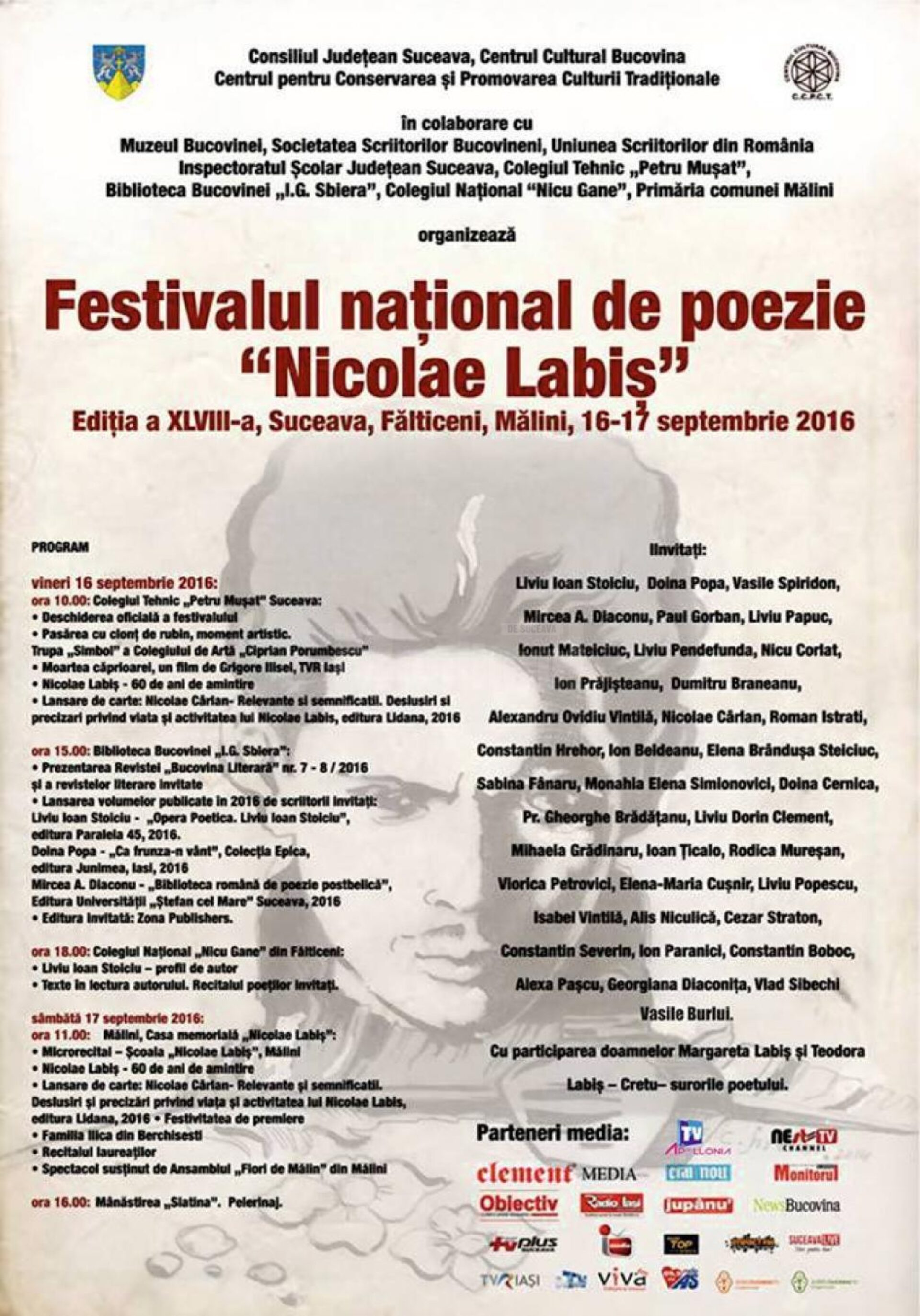 Consiliul Județean Suceava, Centrul Cultural Bucovina – Centrul pentru Conservarea și Promovarea Culturii Tradiționale, în colaborare cu Muzeul Bucovinei, Societatea Scriitorilor Bucovineni, Uniunea Scriitorilor din România, Inspectoratul Școlar Județean Suceava, Colegiul Tehnic „Petru Mușat”, Biblioteca Bucovinei „I.G. Sbiera”, Colegiul Național „Nicu Gane” Fălticeni și Primăria comunei Mălini organizează, în perioada 16-17 septembrie a.c., la Suceava, Fălticeni și Mălini, cea de-a XLVIII-a ediție a Festivalului național de poezie „Nicolae Labiș”.