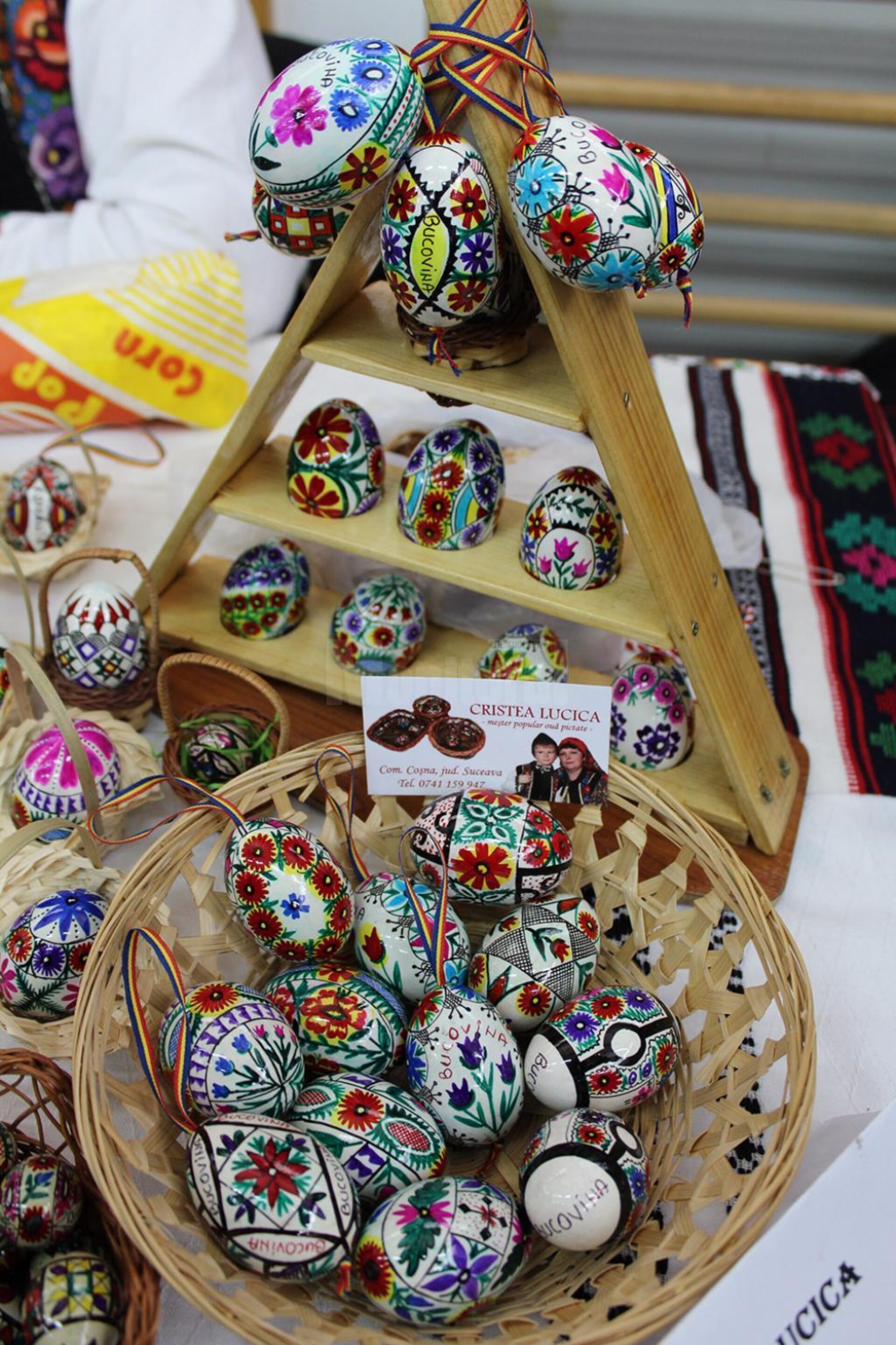 Așezate în coșulețe cu verdeață, precum într-un cuibar, aliniate pe ștergare albe, cu motive tradiționale, ori pe țesături de un roșu aprins, ouăle încondeiate după modelul specific fiecărei zone în parte, pictate cu migală sau acoperite cu mărgele colorate, minunatele creații lucrate de mâinile dibace al gospodinelor, dar și ale gospodarilor din Bucovina, farmecă privirile oricui.
