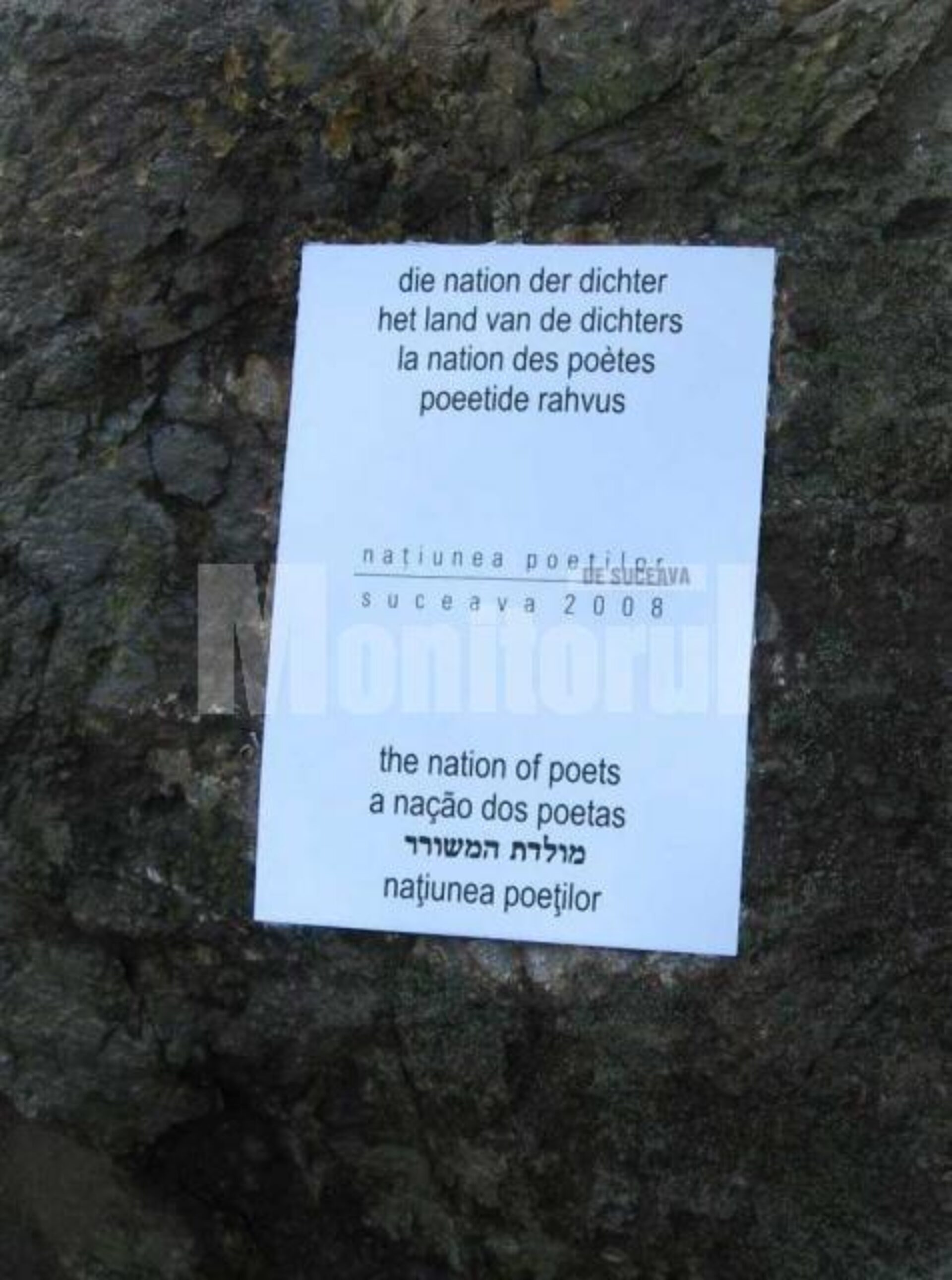 Și s-a mai amplasat cu acest prilej, în incinta Muzeului Satului Bucovinean, Piatra de temelie a Festivalului „Națiunea Poeților”, piatră pe care a rămas însemnat în opt limbi genericul acestui festival, generic pe care-l vor duce cu ei în țările lor, odată cu trofeul primit, toți poeții participanți.