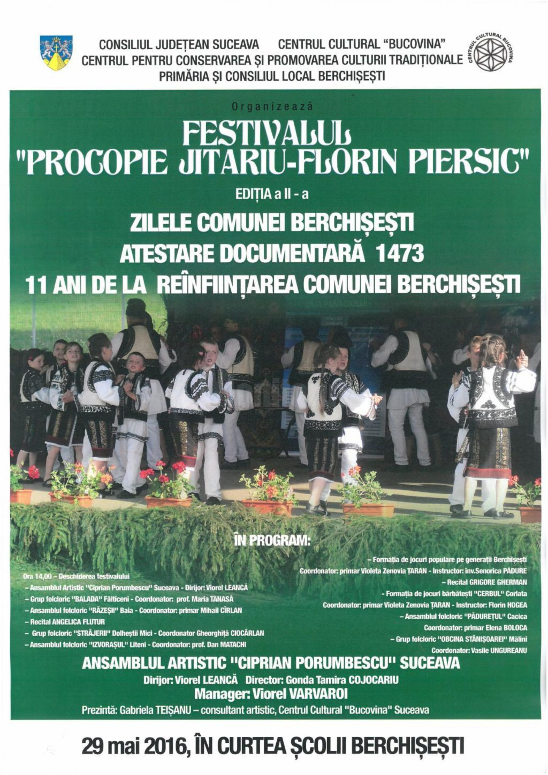 Consiliul Județean Suceava, Centrul Cultural Bucovina – Centrul pentru Conservarea și Promovarea Culturii Tradiționale, Primăria și Consiliul Local Berchișești organizează duminică, 29 mai a.c., în curtea Școlii Berchișești, cea de-a II-a ediție a Festivalului „Procopie Jitariu – Florin Piersic”.