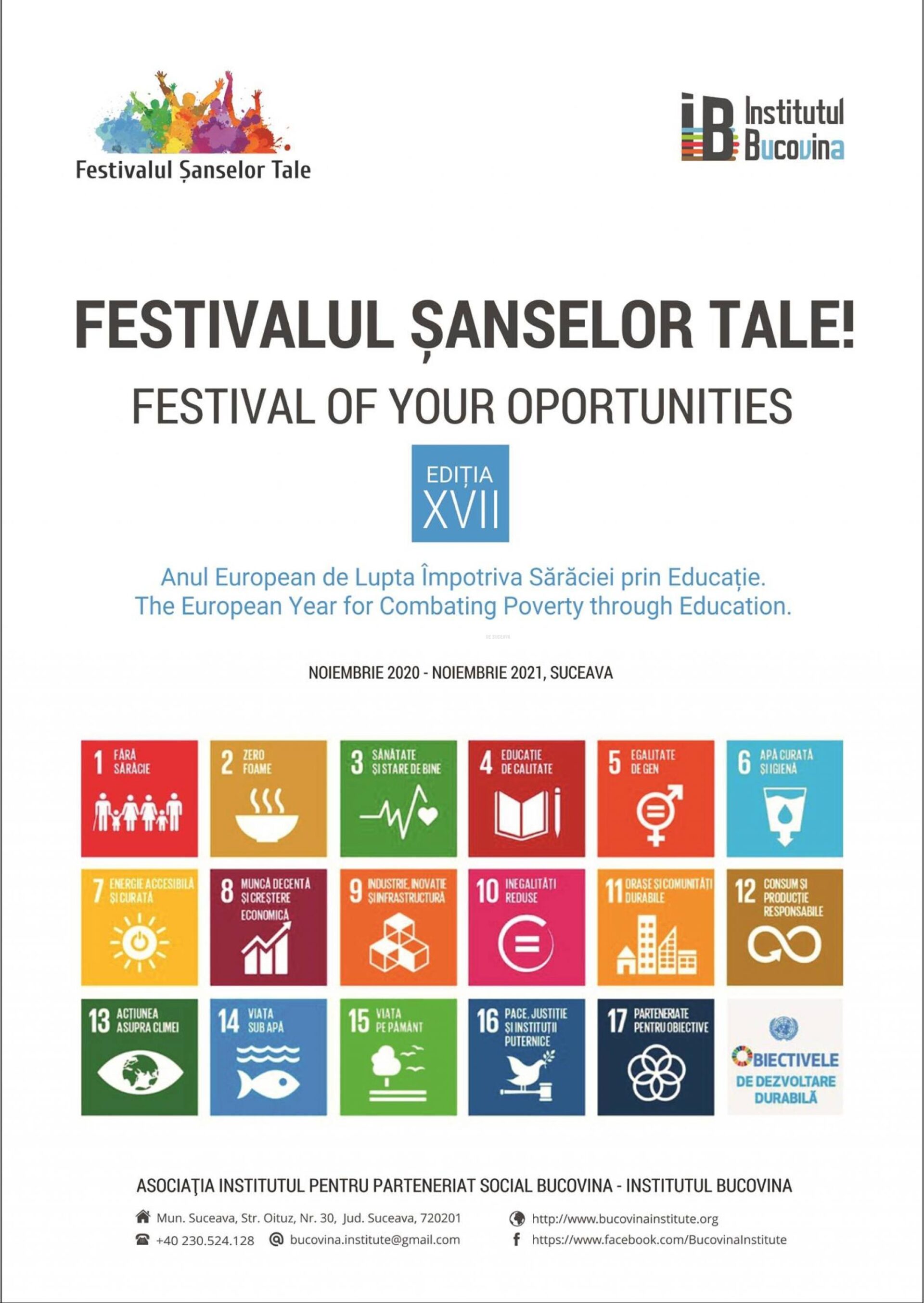 Asociația Institutul pentru Parteneriat Social Bucovina organizează, în perioada 16-22 noiembrie 2020, sub egida „Anul European de Luptă Împotriva Sărăciei prin Educație”, cea de-a XVII-a ediție a Festivalului Șanselor Tale. Activitățile sunt coordonate de Vasile Gafiuc, președinte al asociației, și Alina Adomnicăi, responsabil de comunicare și social media.
