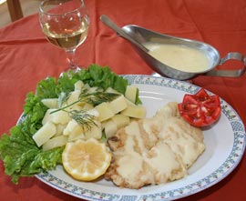 Peștele se sărează, se condimentează cu piper și se stropește cu zeama de la jumătate de lămâie. Se trece apoi prin făină albă și au bătut și se prăjește în ulei încins pe ambele părți. Într-un vas se pune vinul alb, supa de pește, untul și zeama de la jumătatea de lămâie rămasă, și se lasă la fiert. Când începe fierberea se adaugă smântâna și se condimentează cu sare și piper după gust. Se lasă la foc mic timp de 2 minute după care se adaugă amidonul pentru a lega sosul. Se servește cu cartofi natur.