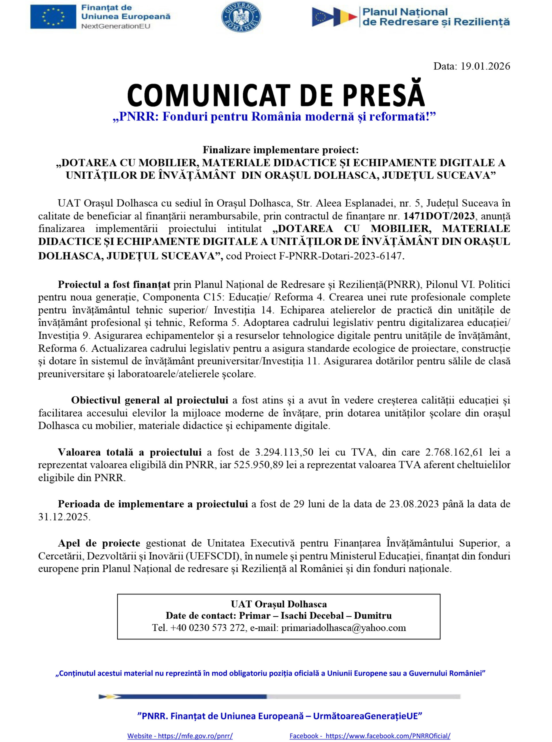 UAT Orașul Dolhasca cu sediul în Orașul Dolhasca, Str. Aleea Esplanadei, nr. 5, Județul Suceava în calitate de beneficiar al finanțării nerambursabile, prin contractul de finanțare nr. 1471DOT/2023, anunță finalizarea implementării proiectului intitulat „DOTAREA CU MOBILIER, MATERIALE DIDACTICE ȘI ECHIPAMENTE DIGITALE A UNITĂȚILOR DE ÎNVĂȚĂMÂNT DIN ORAȘUL DOLHASCA, JUDEȚUL SUCEAVA”, cod Proiect F-PNRR-Dotari-2023-6147.